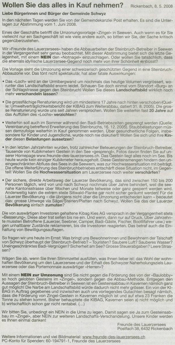 p. Letzte Woche hat die KIBAG-Gruppe – sie betreibt den Steinbruch im ‚Zingel’ - den Abstimmungskampf für die Umzonungsvorlage vom 1. Juni 2008 eröffnet. Sie hat ihre Firmenzeitschrift unter dem Namen ‚Splitt und Schotter’ in alle Haushaltungen der Gemeinde Schwyz verteilen lassen. Darin legt die Kibag Kies Seewen ihre Gründe dar, weshalb das Stimmvolk unbedingt der Umzonung von 60'000 Quadratmeter geschütztem Wald an der Urmibergflanke oberhalb der Lauerzer Kantonsstrasse zustimmen soll. Es sind rein emotionale Gründe, welche die Firmengruppe ins Feld führt. Denn nicht erwähnt wird, dass das so hoch gelobte Gestein auch in Kavernen abgebaut werden kann. Diese Abbaumethode wird von den Firmenverantwortlichen verworfen, weil dadurch der Firmengewinn kleiner würde als im klassischen, Landschaftsbild zerstörenden Tagabbau.