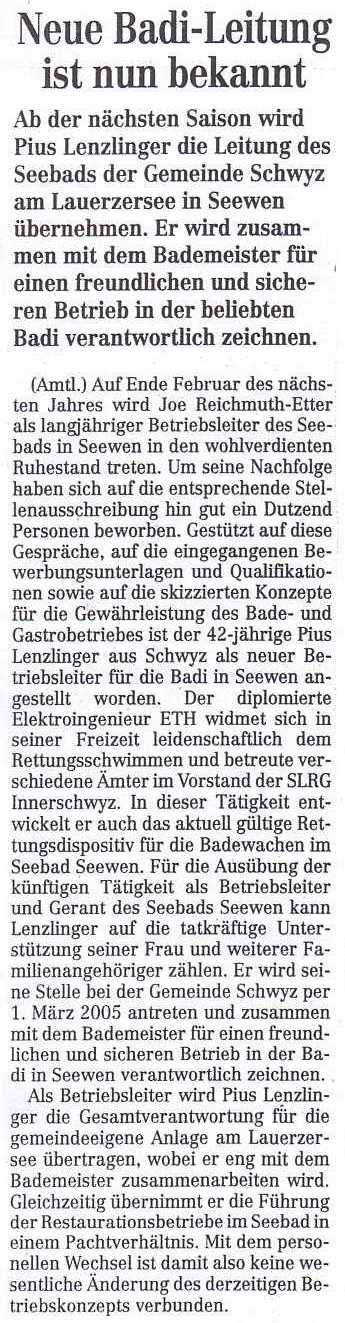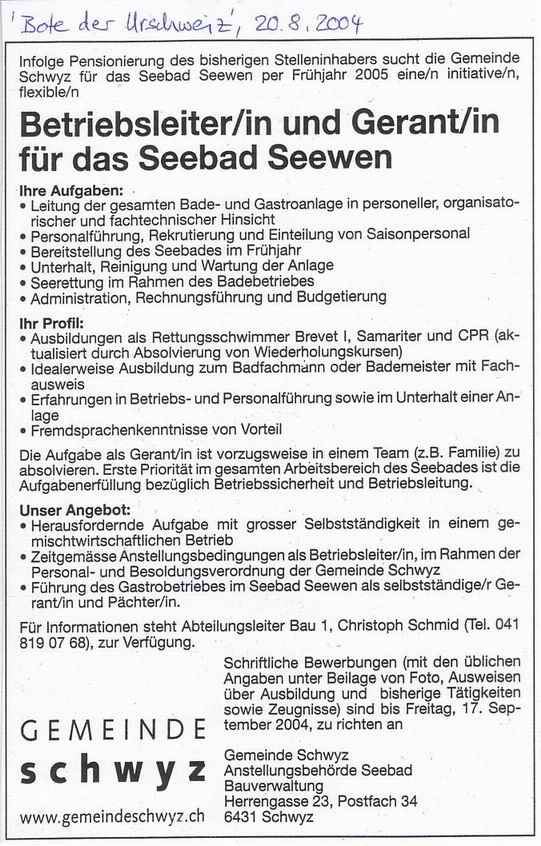 Anmerkung: Am 17. September 2004 ist die Bewerbungsfrist als Betriebsleiter/in und Gerant/in für das Seebad Seewen abgelaufen. Als Eigentümerin des Seebades Seewen wird die Gemeinde Schwyz in den nächsten Wochen den oder die Nachfolger/in von Joe Reichmuth bestimmen.