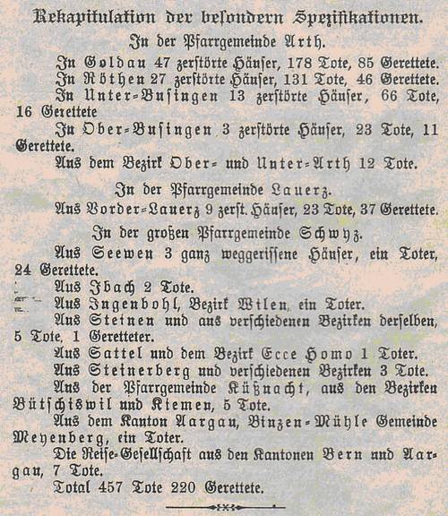 ‚Goldau und der Bergsturz vom Rossberg, 1806 – 1906’ bzw. dem Titel ‚Kurze Beschreibung des Bergsturzes vom Rossberg bei Goldau, Kt. Schwyz’, Kaplan Gustav Ott, Goldau, (Erbauer der neuen Goldauer Pfarrkirche). 1. Auflage 1904, Verlag J. Schill, Luzern
