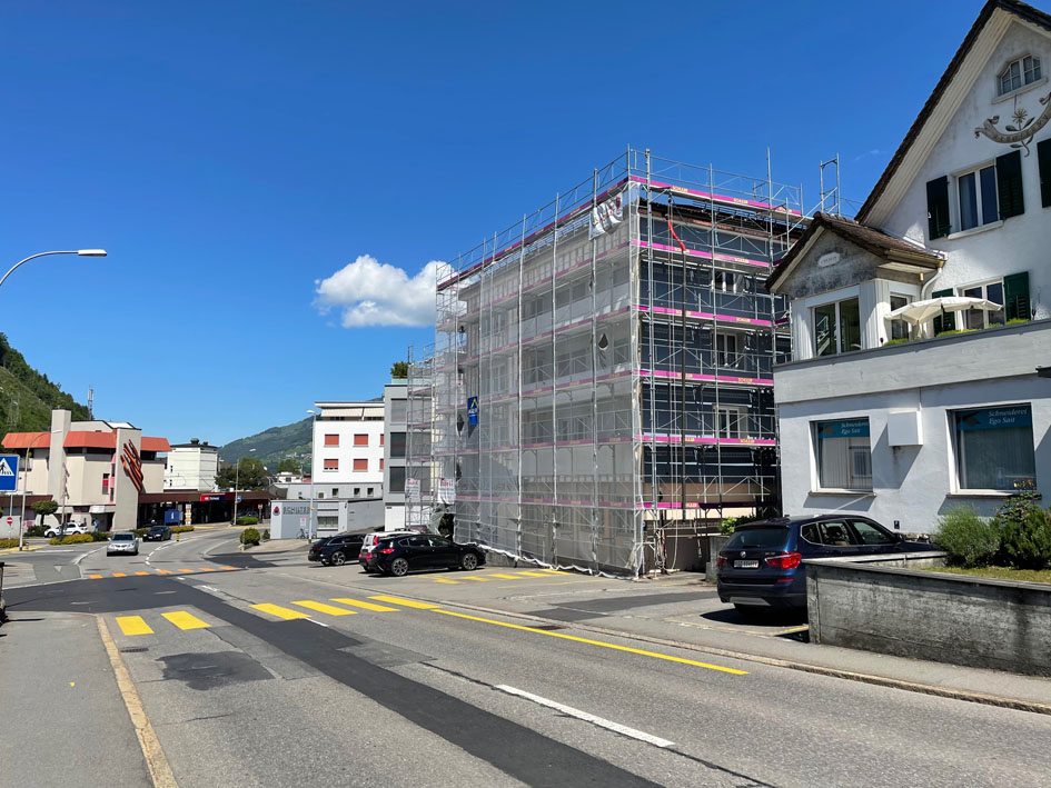 p. Zufall oder nicht? Das ehemalige Postgebäude (jetzt ist noch die Conditorei Schelbert einquartiert) und gegenüber die Mettler-Villa (Bahnhofstrasse 125) sind exakt gleichzeitig eingerüstet. Die Nachkommen der Mettlers (Schwyzerhof, Bahnhöfli, Viehhandel usw.) lassen ihre Immobilien einem Face-Lifting unterziehen. Die Wärmedämmung liess zu wünschen übrig und die Witterung setzte den Fassaden zu. Daher der Schritt, dem eine optische Verschönerung folgt. Zweifelsfrei wird damit der Bahnhofplatz in unmittelbarer Nähe aufgewertet...