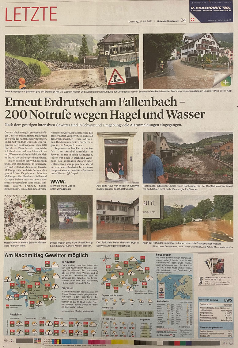 p. Weltuntergangsstimmung am gestrigen Montag, 26. Juli 2021 über Seewen! Wassermassen wie aus Badewannen (und nicht wie aus Kübeln!) haben die Bevölkerung innert Minuten in Angst und Schrecken versetzt! Bäche sind über Wiesen und Strassen geflossen, wo seit Menschengedenken noch nie ähnlich-gleiche Ereignisse stattgefunden hatten. Zahlreiche Keller und Garagen wurden regelrecht geflutet, so dass tags darauf das grosse Aufräumen angesagt war. Trotz aller Missbill, Menschen kamen glücklicherweise keine zu Schaden. Wenn der Sommer so weitergeht wie bisher, wird er wohl alle 'nassen' Rekorde hierzulande brechen...