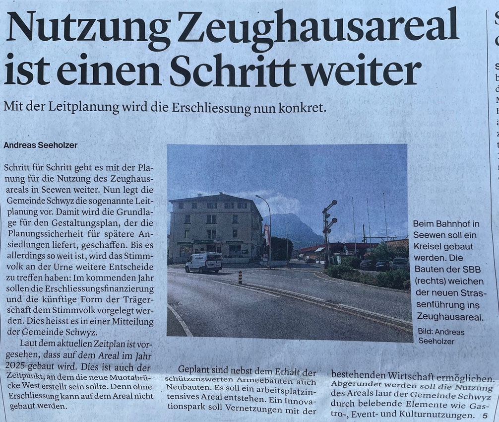 Mit folgendem LINK informiert die Gemeinde darüber, was sie gedenkt, könnte auf dem Areal des ehem. Zeughauses Seewen-Schwyz entstehen: https://www.gemeindeschwyz.ch/_docn/3244744/Zeughausareal_Leitplanung_finale_Fassung.pdf