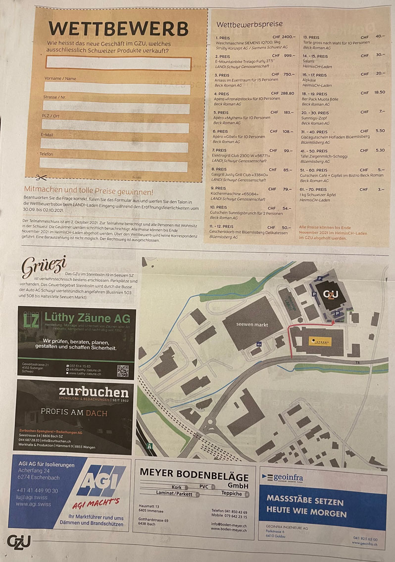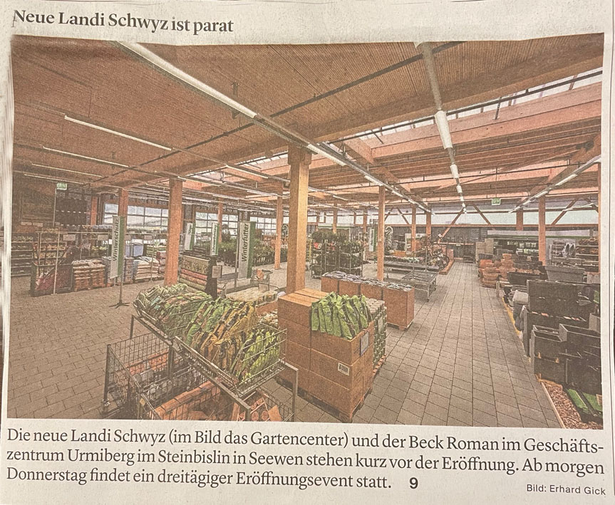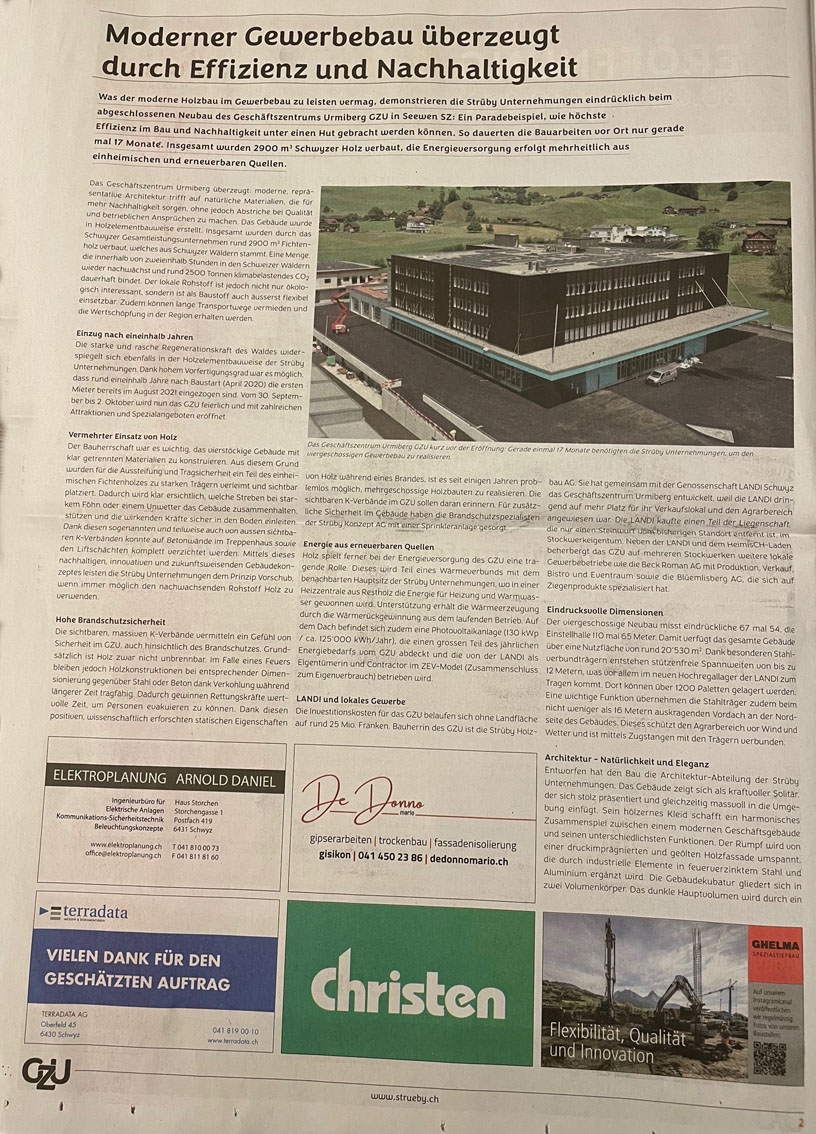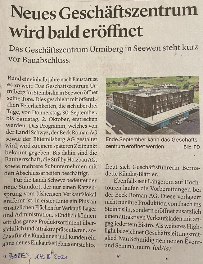 p. Heute Donnerstag bis und mit Samstag wird im 'Steibissli' am westlichen Dorfrand von Seewen kräftig gefeiert. Grund ist die Inbetriebnahme des Neubaus GZU, was ausgedeutscht GewerbeZentrumUrmiberg heisst. Unter Federführung der Unternehmensgruppe Strüby ist in rund 17 Monaten ein Neubau hochgezogen worden. Belebt wird das neue Gewerbezentrum ausschliesslich von heimischen Unternehmen. Während der Eröffnungstage locken zahlreiche Vergünstigungen und Attraktionen.