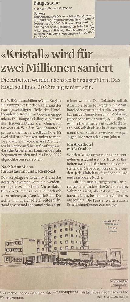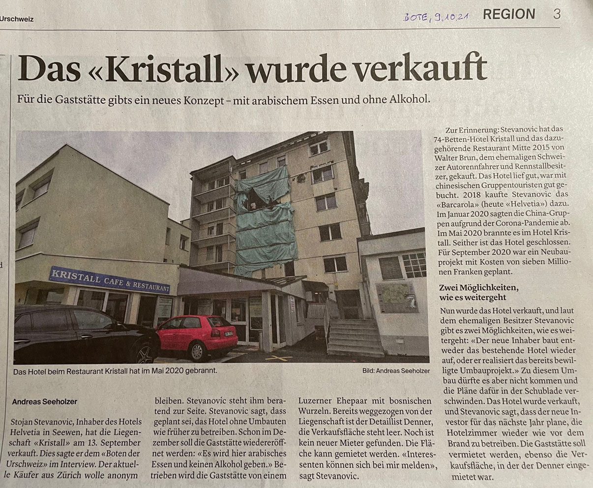 p. Vor knapp eineinhalb Jahren ein Schrecken im Dorf: das komplett belegte Hotel 'Kristall' brannte! Zum Glück blieb es beim Sachschaden. Schnell ging es um die Frage des 'Wie weiter'? Für den Eigentümer war klar, dass das Haus neu und etwas grösser wieder aufgebaut werden sollte. Das Baugesuch für das 'neue Kristall' wurde genehmigt, eigentlich hätten jetzt die Baumaschinen auffahren sollen. Doch es kam anders. Wie der 'Bote' weiss, hat Stojan Stefanovic das Haus an einen Investor verkauft. Dieser überlege sich zurzeit zwei Szenarien: den Wiederaufbau des teilverbrannten 'Kristall' in seiner ursprünglichen Grösse oder dann den totalen - und bewilligten - Neubau.
