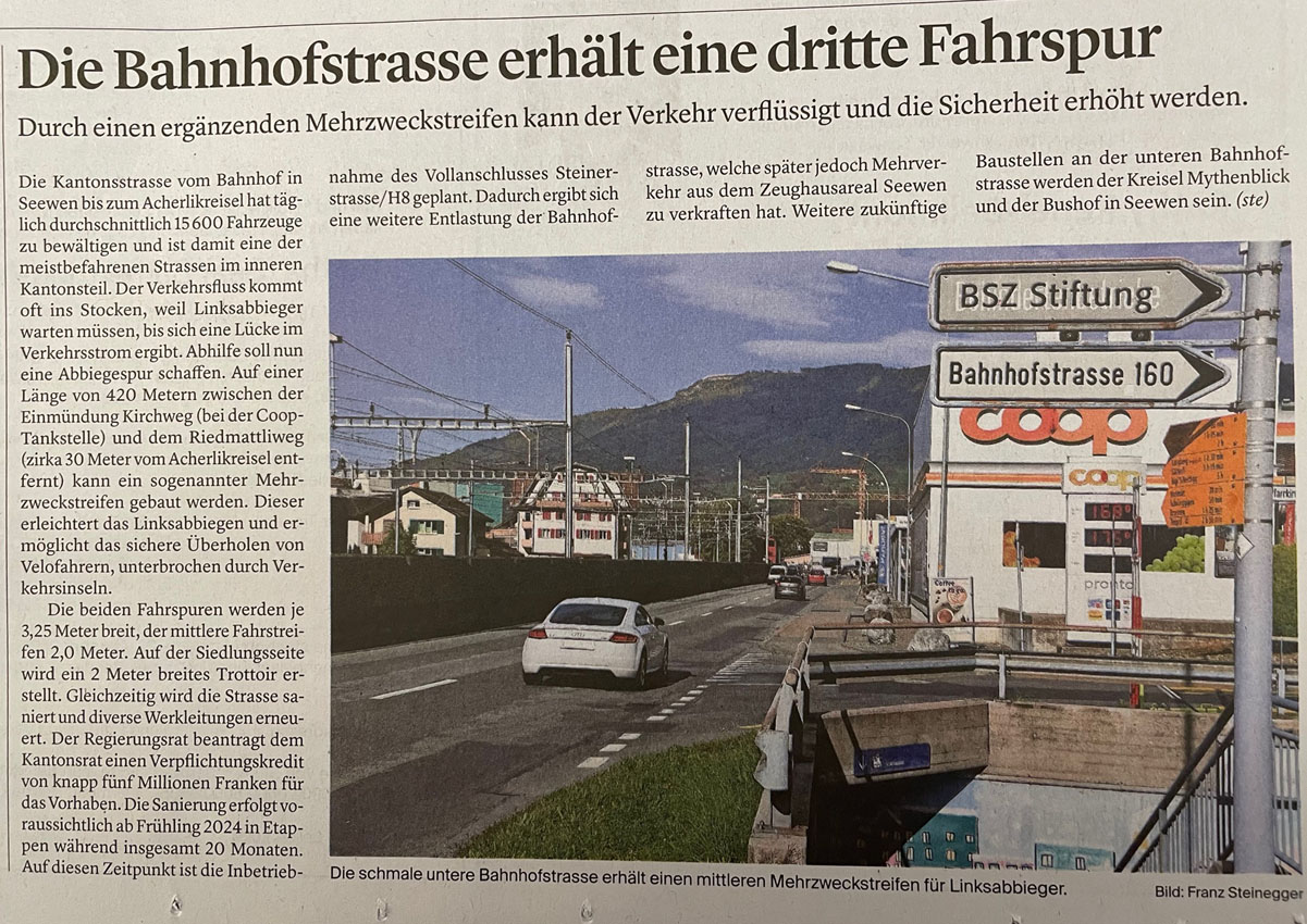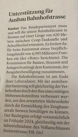 p. Es scheint sich zu bewahrheiten, was Ur-Einwohner Seewens schon lange befürchten: an der bekannten Verkehrsflut durch Seewen wird weiter gewerkelt. Statt den Verkehr um das Dorf herum zu leiten, wird von den Staatsplanern weiterhin voll auf die Karte 'noch mehr Verkehr durch das Zentrum' gesetzt. Dies ganz im Gegensatz zu andern Ortschaften im Kanton Schwyz (z.B. Rothenthurm, Küssnacht, das nahe urnerische Sisikon usw.), wo seit Jahren an Dorfumfahrungen geplant und teilweise gebaut wird. Doch Seewens Bedürfnisse nach mehr Wohnqualität, die bleiben aussen vor. Und so soll es auch in Zukunft bleiben. Nur so ist zu verstehen, weshalb der Kanton mit seiner Behörde weiterhin viel Geld in die Planung einer stark verbreiterten Bahnhofstrasse steckt. (Der 'Bote' berichtete in seiner Ausgabe vom 26.10.21 darüber, siehe unten). Zu den hohen 'Vorinvestitionen' gehören dazu Liegenschaftskäufe und Arrondierungen (wie z.B. Landkauf beim 'Kristall', beim 'Gaswerk', den Kauf der Liegenschaft 'Rosengarten', 'Schwyzerhof' usw.). Damit werden Voraussetzungen geschaffen, um eben die Hauptachse durch Seewen - die Bahnhofstrasse - auszuweiten. Alternativ dazu gäbe es seit 2006 ein Projekt eines 'Dorfumfahrungstunnels'. Mit diesem würde Seewen südlich umfahren, das lokale Strassennetz vom Durchgangsverkehr verschont. (Siehe Beitrag Dorfnews, Archiv, 11.4.2006). Doch für dieses weitsichtige und nachhaltige Projekt finden sich im Regierungsviertel in Schwyz keine Sympathisanten. Die Tunnelidee kam eben nicht aus der eigenen 'Küche'...