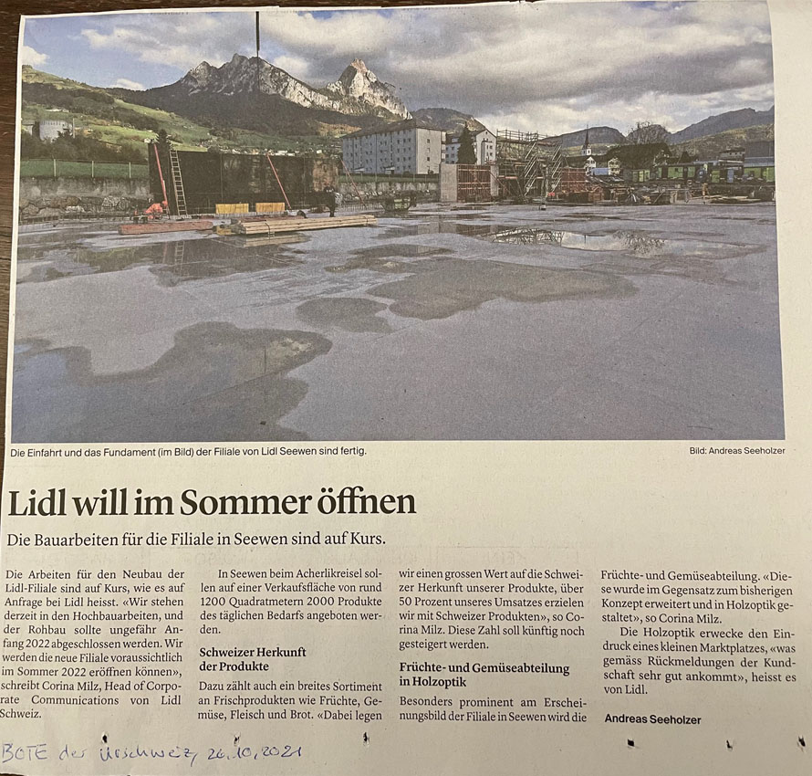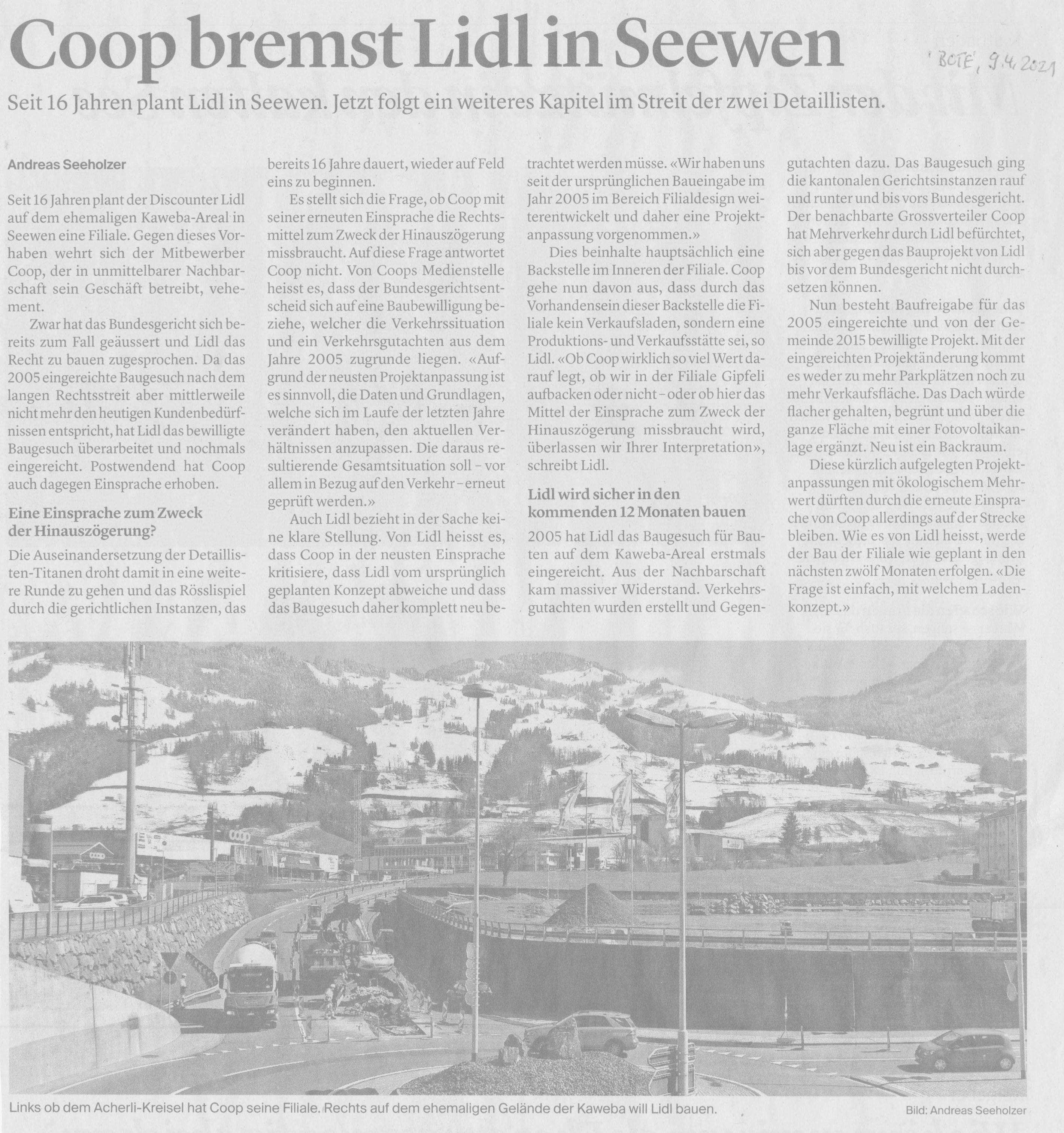 p. Das ist wohl schweizweit einmalig: da will ein Unternehmen im Schwyzerland eine Filiale bauen - und wird seit 16 Jahren ausgebremst. Doch am Plan wird festgehalten: direkt beim Autobahnanschluss Seewen will der deutsche Discounter Lidl auf dem Gelände der ehemaligen 'KAWEBA'-Halle eine Filiale eröffnen. Das wäre die zweite im 'innern' Kantonsteil. Die andere steht im 'Fänn' bei Küssnacht. Fast schien es, dass das Bauwerk in Seewen 2021 doch noch vollendet werden könnte - doch die Rechnung wurde ohne den 'Mitbewerber' Coop gemacht. Denn dieser hat just auf die abgeänderten Baupläne im Frühling 2021 reagiert und wieder Einsprache gemacht (Siehe Zeitungsbericht vom 7.4.21). Die Lidl-Verantwortlichen aber bleiben optimistisch, auch dieses jüngste Hindernis aus dem Weg räumen zu können.