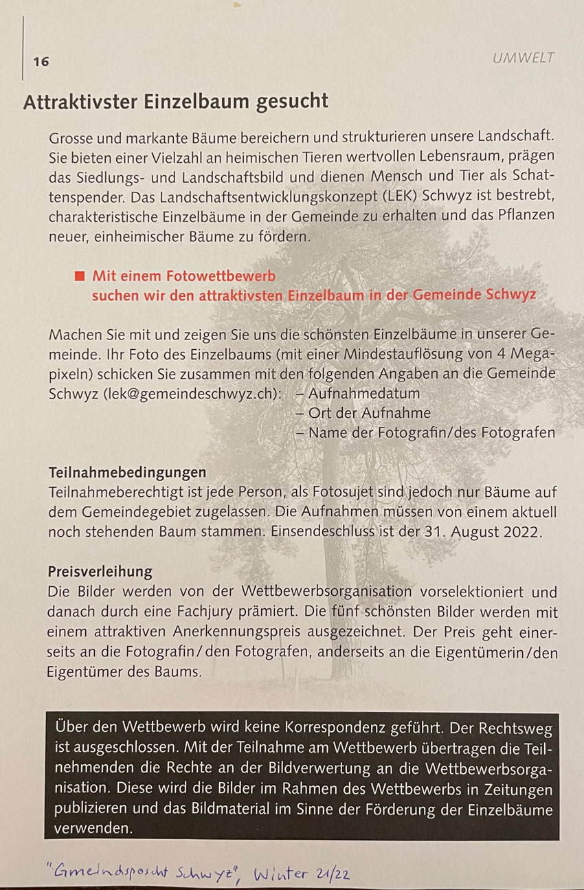 Dies trotz Bitten von über 800 Personen, die beiden Bäume Eibe und Ginkgo biloba stehen zu lassen... (siehe Dorfnews). Jetzt sorgt sich auch die Gemeinde um den Erhalt landschaftsprägender Bäume - für einige markante Bäume leider schon zu spät. Mit einem Fotowettbewerb soll das Volk sensibilisiert werden, markante Bäume zu achten. In der jüngsten Ausgabe der 'Gmeindsposcht' wird der Wettbewerb erklärt: