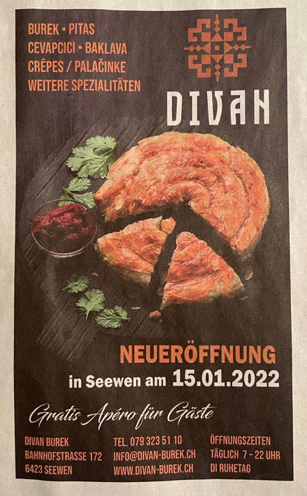 p. Anfangs Oktober letzten Jahres reichte eine Zuger Firma ein Baugesuch für den durch einen Brand geschädigten Teil des 'Kristall' ein (Siehe Meldung vom 10.10.2021). Der 'alte' Teil des Doppelgebäudes soll für rund 2 Mio Franken saniert und in ein Aparthotel überführt werden. Der 'neuere' Teil des Hauses blieb vom Brand verschont. Jetzt wird in diesem - nach einer längeren Pause - wieder Leben einkehren. Wie einem Inserat im 'Bote' vom 14. Januar 2022 zu entnehmen ist, wird am 15. Januar ein Restaurant unter dem Namen 'Divan' seine Türen öffnen. Geprägt ist das Angebot dieses Gastronomiebetriebes fortan von Speisen aus dem Balkan. Glückauf den Betreibern in dieser schwierigen Zeit!
