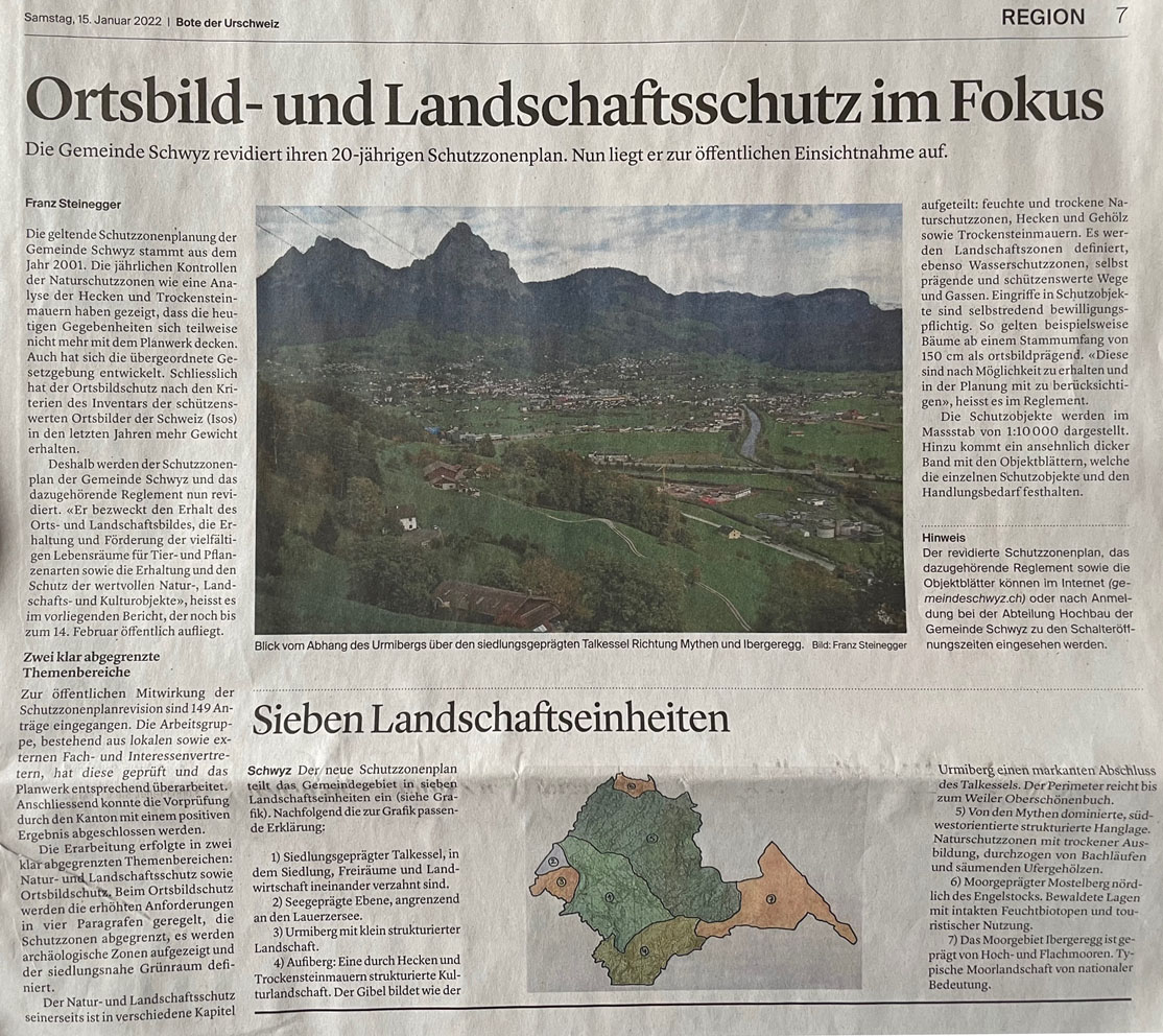 p. Im letzten Jahr angekündigt hat der Gemeinderat Schwyz nun den überarbeiteten Schutzzonenplan öffentlich aufgelegt. Im Kern geht es darum, ein Inventar über Naturschönheiten innerhalb der Gemeindegrenze zu erstellen und es dann rechtsverbindlich erklärt zu lassen. Damit möchte die Gemeinde einer weiteren Zerstörung der teils über Jahrhundertealten Natur- und Kulturgüter Einhalt gebieten. Jetzt haben die Einwohner/innen der Gemeinde bis zum Valentinstag 2022 die Möglichkeit, Stellung zum Werk zu beziehen.
