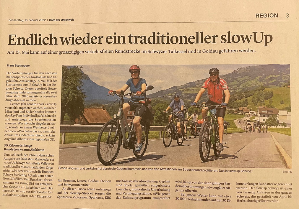 p. Normalerweise findet im Rhythmus von zwei Jahren der ursprünglich alljährliche 'Schwyzer SlowUp' statt. Wäre da vor zwei Jahren nicht 'Corona' aufgetaucht, hätte der Zyklus eingehalten werden können. Doch es kam bekanntlich anders: Gross- und Kleinveranstaltungen zu tausenden wurden auf Geheiss der Behörde abgesagt! In diesen Tagen aber soll das Ende der Pandemie stattfinden. Das stimmt die SlowUp-Planer zuversichtlich. Sofern jetzt nicht wieder 'auf Panik wegen einer neuen Mutante' gemacht wird, findet am 15. Mai 2022 der beliebte 'Langsamverkehrtag' rund um den Schwyzer Talkessel statt. Dies jedenfalls wusste der 'Bote' in seiner Ausgabe vom 10. Februar 2022 seier Leserschaft zu berichten: