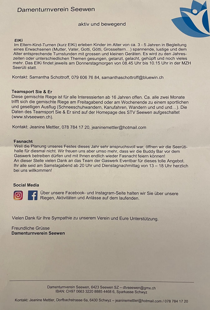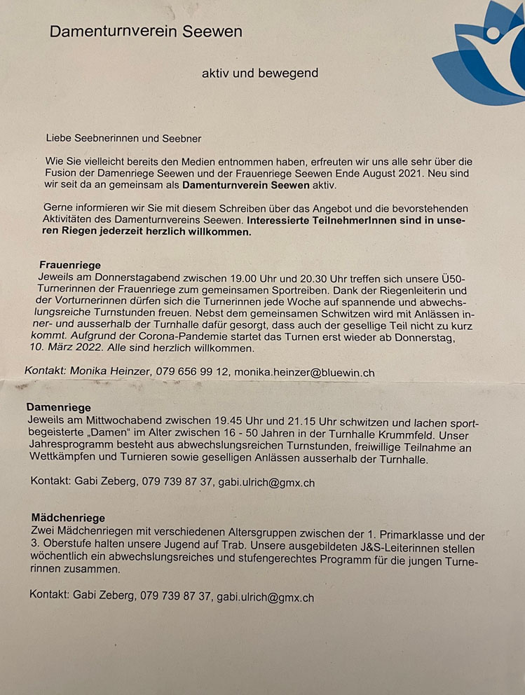 Der zum Damenturnverein fusionierte Verein aus Damen- und Frauenriege liess einen Flyer in alle Seebner Haushaltungen verteilen, auf welchem über die Vereinsaktivitäten berichtet wurde. Appell: Mitmachen gewünscht!