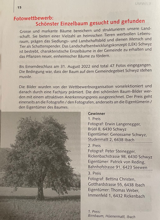 Die Fachjury hat nach Ablauf der Wettbewerbszeit per 31. August 2022 entschieden: der schönste Einzelbaum innerhalb der Gemeindegrenze steht in Ibach. Mit der erstmaligen Durchführung wollte die Gemeinde die Bevölkerung für den Erhalt von Landschaft prägenden Bäumen sensibilisieren. Auslöser war die Abholzung zweier über 200-jähriger Parkbäume im Herbst 2021 in Unterseewen, die einem Bauvorhaben der Landeigentümerschaft weichen mussten.