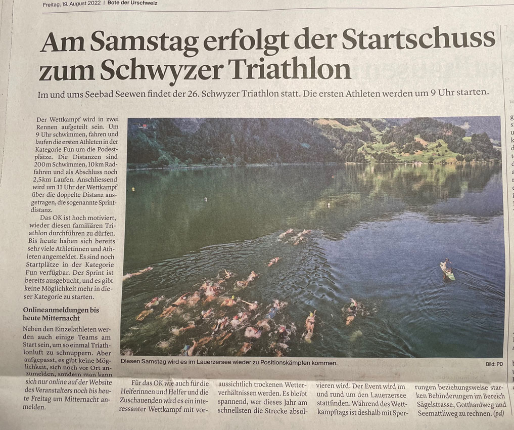 p. Die Trainingsbedingungen in den letzten Wochen waren hervorragend. Jetzt gilt es ernst: Morgen Samstag, 20. August 2022, wird zu einer weiteren Ausgabe des Schwyzer Triathlons gerufen. In verschiedenen Kategorien können sich 'Super-Sportler' im Schwimmen, im Radfahren und im Laufen mit Mitbewerbern messen. Eine Anmeldung ist auch noch an der Tageskasse möglich.