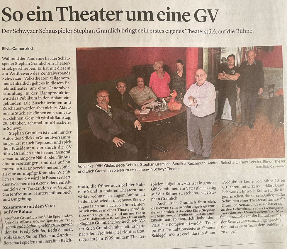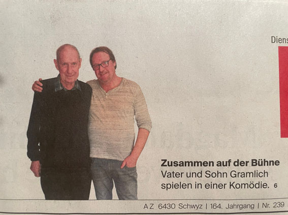 ...auf der Bühne Theater spielt, dann ist das doch eher ungewöhnlich. Nur nicht für die Gramlichs aus Seewen. Für sie ist es 'normal'. Sie pflegen eine gute Vater-Sohn-Beziehung, die sich durchs Leben zieht. So war Vater Erich 'höchster Seebner Fasnächtler', Kaiser Negus Negesti XXIII. von Addis-a-Seeba (1986-1988). Sein Sohn Stephan folgte ihm 2012-2014 als Kaiser Negus Negesti XXXVI.. Und auch 'Bühnenerfahrung' haben beide aufzuweisen - beide sind Mitglied bei der 'Bühne 66' in Schwyz. Jetzt hat Sohn Stephan erstmals ein Theaterstück geschrieben, das nun achtmal zur Austragung gelangt. Start ist am 29. Oktober 2022 im 'Hirschen' in Schwyz. Mit von der Partie: sein Vater. Der Titel des Stücks: 'Generalversammlung'. Details darüber wusste der 'Bote der Urschweiz' seiner Leserschaft in der Ausgabe vom 18. Oktober 2022 zu berichten:
