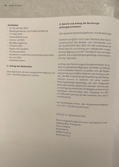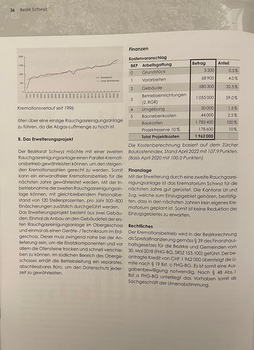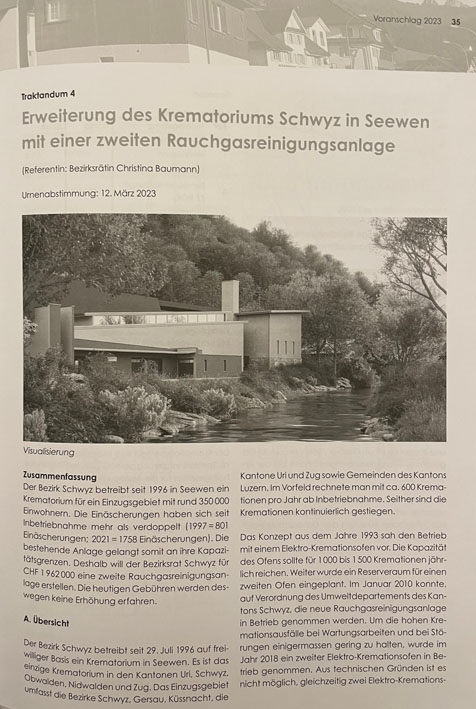 p. Am 22. Dezember findet ab 20 Uhr eine ordentliche Bezirksgemeindeversammlung im MythenForum in Schwyz statt. Traktandiert ist unter Punkt 4 ein Sachgeschäft, über welches am 12. März nächsten Jahres an der Urne abgestimmt werden soll: die Erweiterung des Krematoriums mit einer zweiten Rauchgasreinigungsanlage im Umfang von knapp zwei Millionen Franken. Details hierzu liefert die jüngste Postille des Bezirksrates Schwyz, welche in alle Haushaltungen verteilt wurde. Dass es heute zu dieser Idee kommt, war vorhersehbar. Schon bei der Planung der Anlage anfangs der 1990er Jahre kritisierte die Bevölkerung Seewens, dass das Krematorium ‘in Salamitaktikmanier’ realisiert werde. Die Emotionen gingen hoch. Vor allem die Standortfrage gleich neben der Autobahn löste wüste Reaktionen aus – auch wegen der ‘St. Florianspolitik’ des damaligen Bezirksrates. Alle zuvor vorgeschlagenen Standorte scheiterten an der Opposition der Anwohnerschaft. So war die erste Urschwyzer Verbrennungsanlage erst beim Friedhof ‚Bifang’ nahe des Spitals Schwyz angedacht. Doch dort machten die Planer des Bezirks die Rechnung ohne die Spitalleitung und die (reiche) Anwohnerschaft. Kurz hierauf wurde dieser Standort aufgegeben. Dann ‚entdeckten’ die Planer einen weiteren möglichen Standort: im Gebiet Kaltbach, nahe des ehemaligen Gefängnisses. Gut angebunden an das überregionale Verkehrsnetz bietete sich die geplante Parzelle nahe der H8 hiefür geradezu an. Doch auch hier: die Planer rechneten nicht mit dem Widerstand insbesondere eines Mitgliedes aus dem Bezirksrat, der in der Nähe wohnte und einen Restaurantbetrieb führte. Also liess man auch dort die Pläne fallen... und fand schliesslich den besten aller Standorte für einen Leichenverbrennungsofen in Unterseewen. Dort – fernab jeglicher Zivilisation – störe ein Krematorium niemanden. Die Reklamationen des Einwohnervereins Seewen nützten nichts, ‚Sankt Florian’ gewann das Rennen. Und Recht bekamen auch die damaligen Kritiker, die voraussagten, dass irgendwann einmal ein zweiter Verbrennungsofen angeschafft werde. Das ist schon 2018 geschehen. Jetzt geht es um die Einbringung einer zweiten Rauchgasreinigungsanlage, die es erlaubt, bei Wartungs- und anderen Arbeiten mindestens die ‘andere Bahn’ in Betrieb zu halten. Mit 1758 Einäscherungen 2021 hat sich die Zahl seit Inbetriebnahme der Anlage 1997 mehr als verdoppelt.