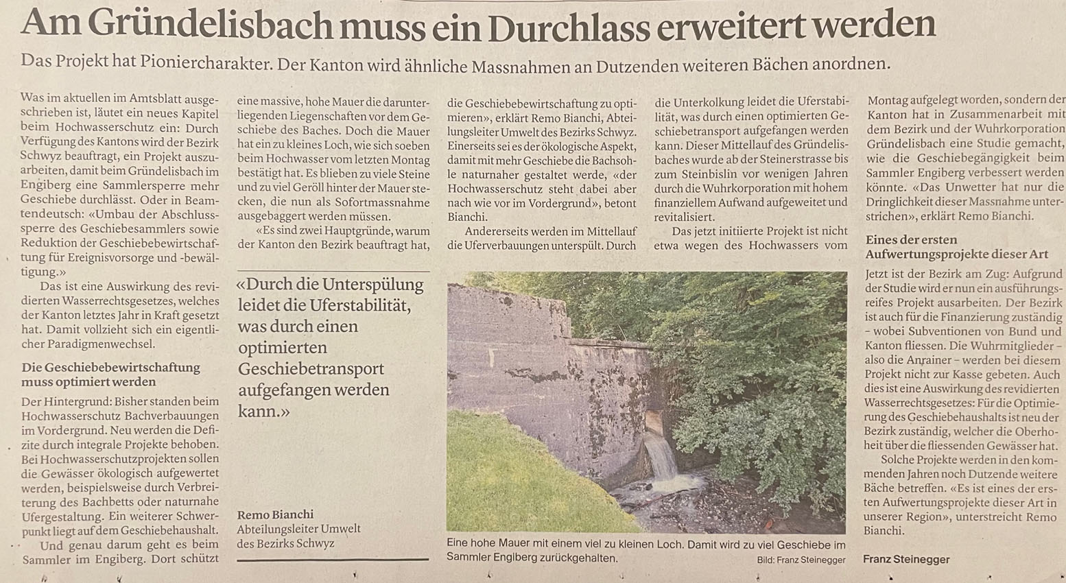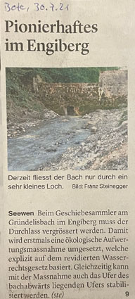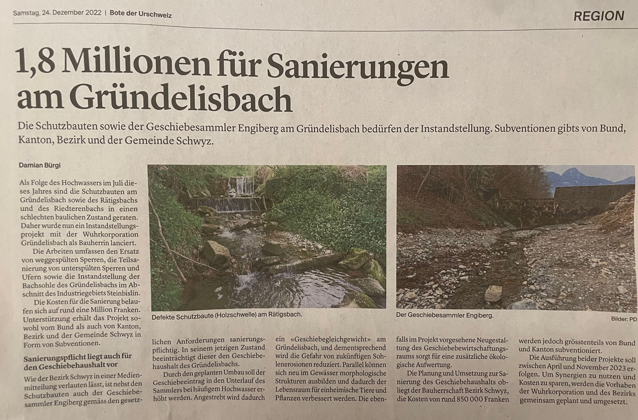 p. Im Jahre 2013 wurde ein grosser Abschnitt des 'Gründelisbach' im Gebiet Engiberg westlich von Seewen umfassend saniert. Es betraf den Abschnitt nördlich des 'Paradiesli'/Engiberg bis fast hinunter zum Schützenhausweg. Im Mittelpunkt der damaligen umfangreichen Arbeiten stand vor allem die ökologische Aufwertung. Der Bach wurde in ein natürliches Bett zurückverlegt. Nun steht ein weiterer Abschnitt vor der Sanierung. Es betrifft den Abschnitt vom erwähnten 'Paradiesli' bachaufwärts inklusive Geschiebesammler. Ausschlag dafür ist eine Verbesserung des Hochwasserschutzes - in Bachnähe befinden sich Gebäulichkeiten - und das neue Wasserrechtsgesetz. Neu tragen bekanntlich nicht mehr die Anrainer der Bäche primär die finanzielle Last; gemäss des neuen Gesetzes sind die Bezirke nun gefordert. Der 'Gründelisbach' sei einer der ersten Bäche, der unter dem neuen Wasserrechtsgesetz des Kantons saniert werde, heisst es.