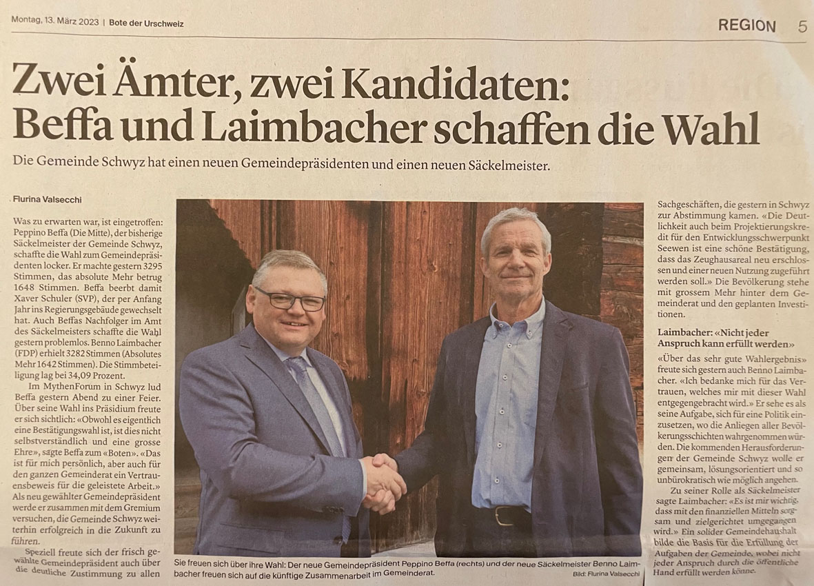 p. Mit der Wahl des Seebners Xaver Schuler-Steiner vom Gemeindepräsidenten zum Regierungsratsmitglied wurde der Gemeinderatsvorsitz vakant. Dieser musste also wieder neu besetzt werden. Darum bemühte sich Säckelmeister Gemeinderat Peppino Beffa-Reichmuth. Und auch für den frei werdenden Job als Säckelmeister musste ein Ersatz gesucht werden. Mit Benno Laimbacher stand ein ausgewiesener Financier parat. Was kaum überraschte: beide Mannen schafften die Wahl am vergangenen Wochenende locker! Das lag sicherlich auch an ihrer Bekanntheit, sind sie beide doch gut vernetzt in allerlei 'Aemtli'.