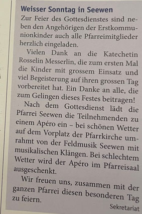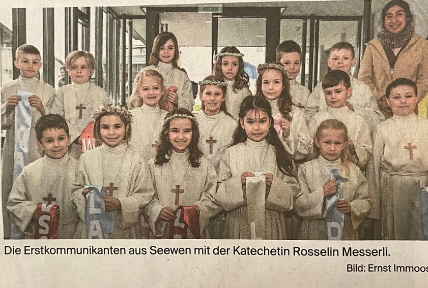 p. Nach zwei 'schwierigen' von Corona geprägten Jahren fand am 16. April in der Pfarrei Seewen wieder ein 'normaler' Weisser Sonntag statt. 17 Erstkommunikant/inn/en wurden seit Wochen durch Katechetin Rosselin Messerlin auf diesen grossen Tag im Leben eines Christen vorbereitet. Obwohl das Wetter morgens nicht so recht 'wollte', die Freude über den Tag war grösser als jeglicher Sonnenstrahl! Nach dem feierlichen Weiss-Sonntag-Gottesdienst, der erstmals umsäumt wurde von Organist Cyrill Fischlin, lud die Pfarreigemeinde die Gemeinschaft zu einem Apéro ein.