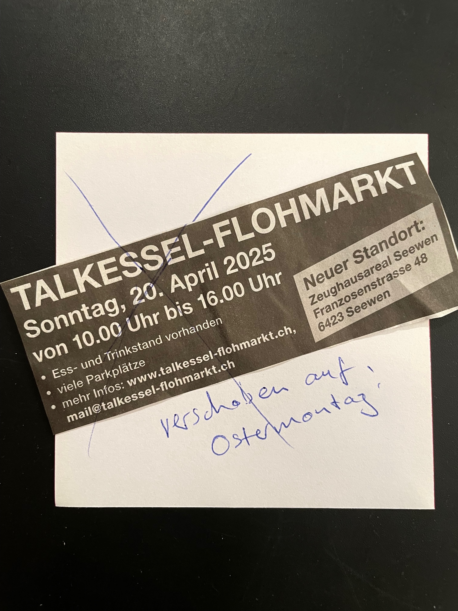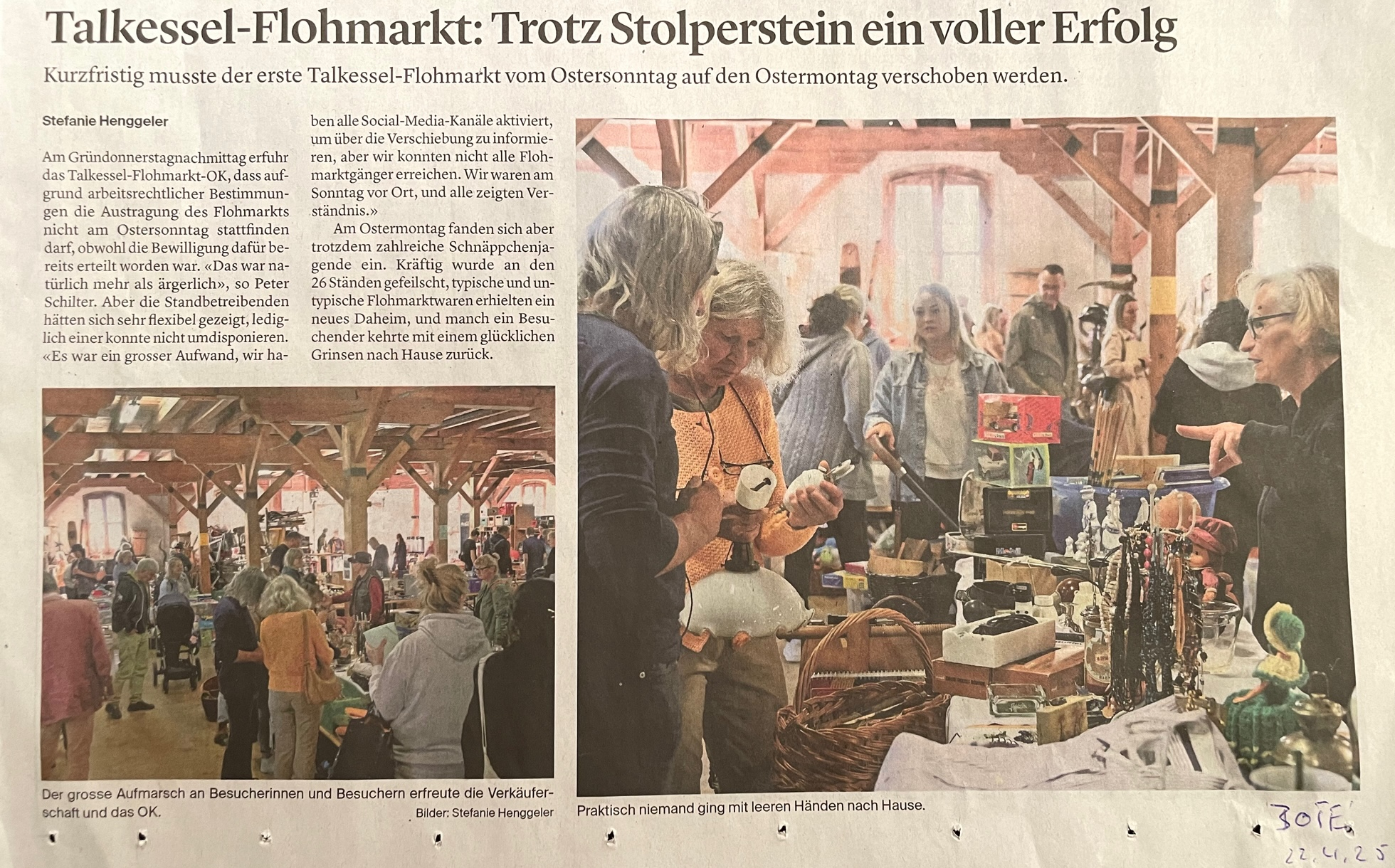 Der nächst Flohmarkt auf dem Areal des ehemaligen Zeughauses findet definitiv am 25. Mai 2025 statt. Siehe www.talkessel-flohmarkt.ch