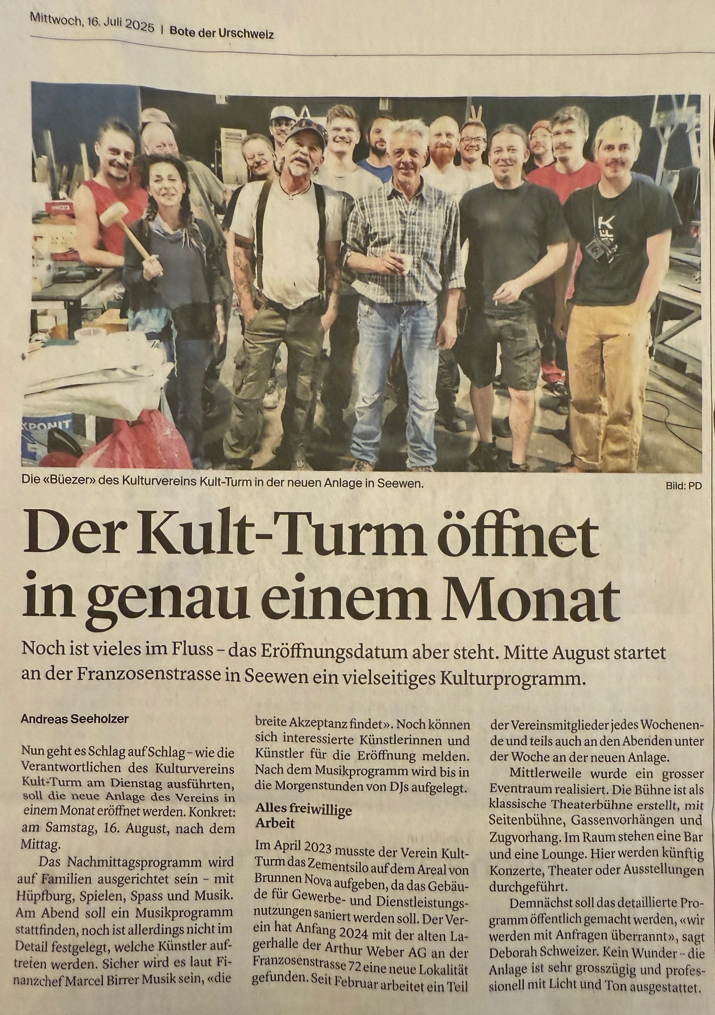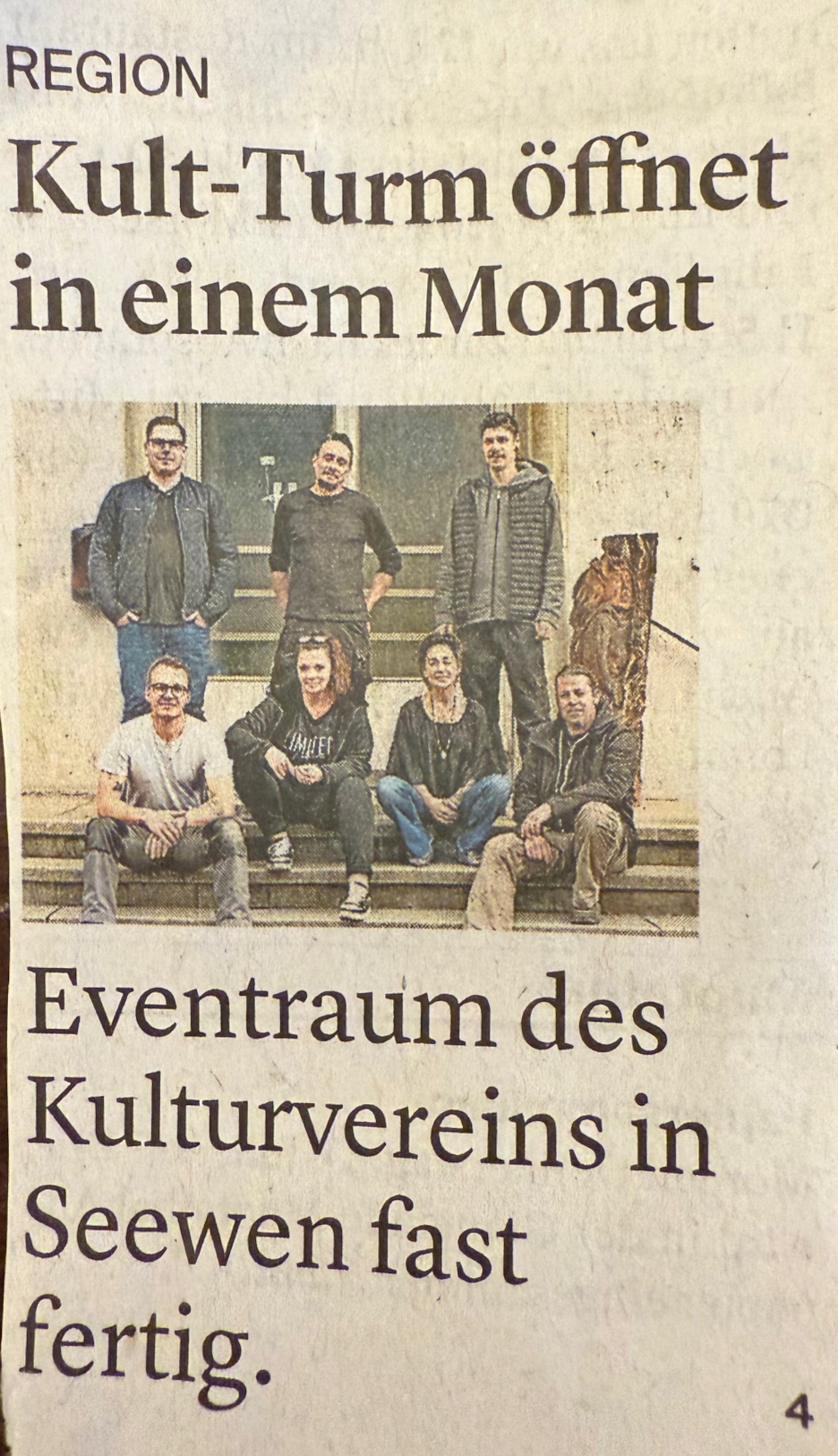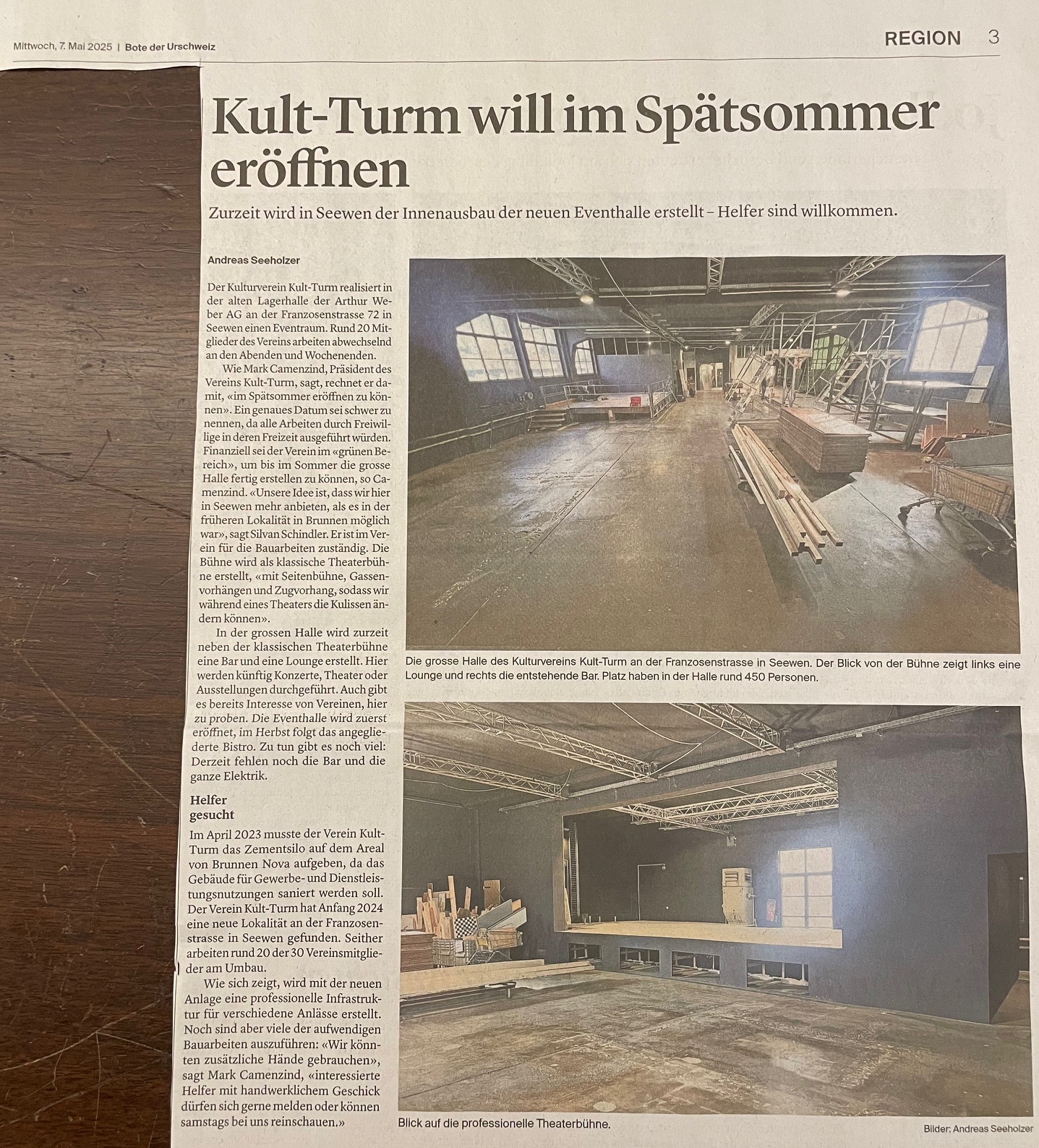 p. In vielen Schweizer Ortschaften sorgt sich die Oeffentliche Hand um Austragungsorte für allerlei Kultur. Nicht so in Seewen! Da sind es Private oder private Trägerschaften, die dieses Vakuum füllen. In Seewen sind dies die Betreiber des 'Gaswerk' an der Bahnhofstrasse, des 'Theater Schwyz' einen Steinwurf weit daneben und schon bald auch der Verein Kult-Turm, der momentan einen ehemaligen Lagerschuppen an der Franzosenstrasse umbaut....