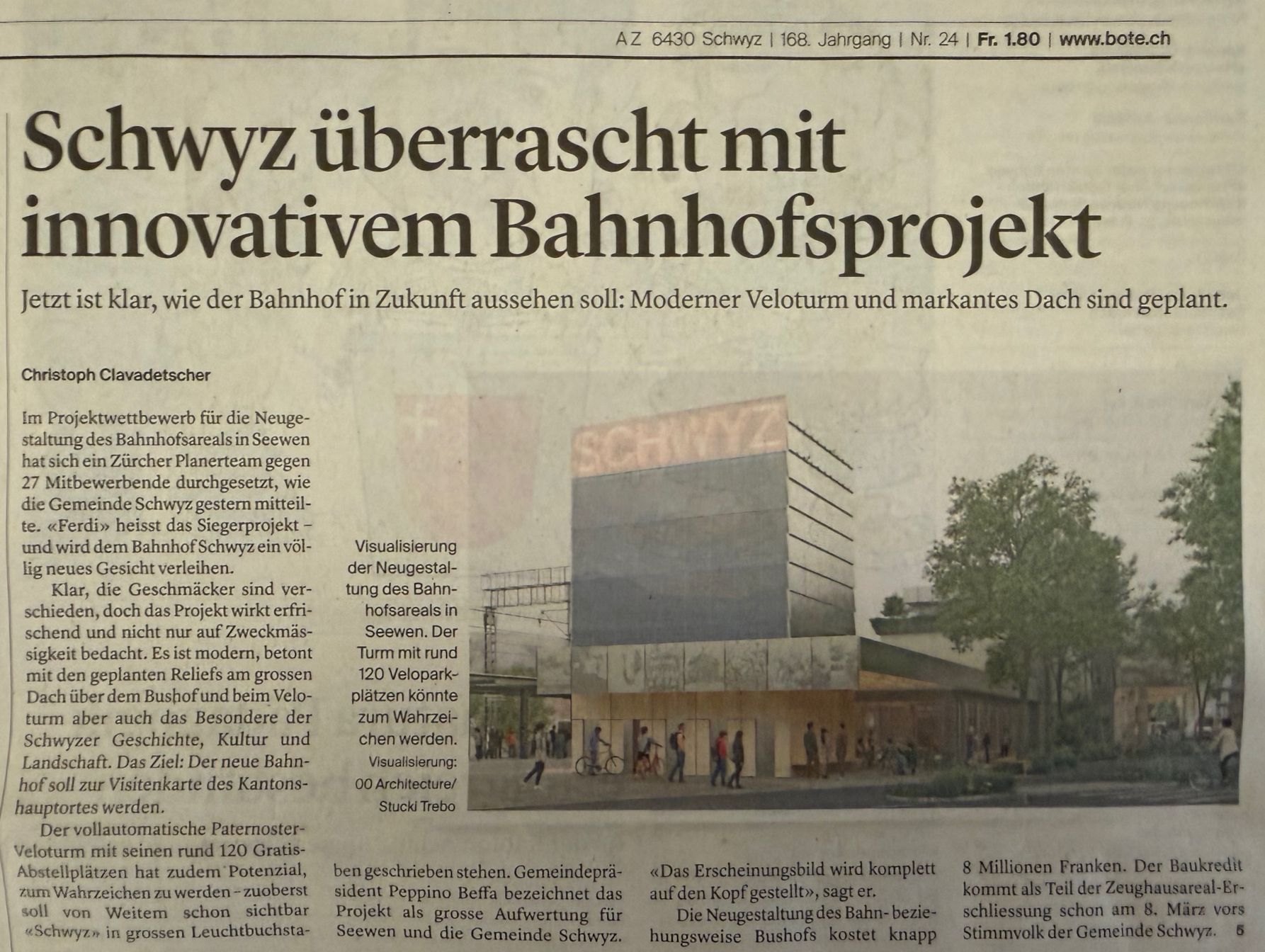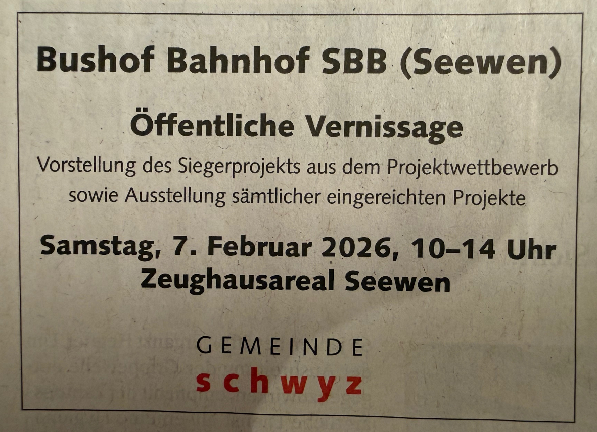p. Der öffentliche Verkehr soll aufgewertet, lies attraktiver, werden. Dass dies gelingt, dafür muss auch die Infrastruktur angepasst werden. Die Gemeinde Schwyz - zu der auch bekanntlich Seewen gehört - plant kräftige Investitionen (wir berichteten darüber). Allem voran soll der Bushof neben dem Bahnhofgebäude ein neues Aeusseres erhalten. Einige Schritte weiter soll auch der Fahrradplatz ein neues zeitgemässes und funktionales Dasein bekommen. In Form eines Turms sehen die Planer die Lösung für die Fahrradparkierung. Letztmals wurden im September 1983 mit einem grossen 'Bahnhofsfäscht' der Platz sowie das Bahnhofgebäude und der Güterschuppen neu in Betrieb genommen. Wie sich der Gemeinderat die Zukunft des Hauptort-Bahnhofs vorstellt, hat er soeben publiziert. Die Diskussion ist eröffnet. Ob die hehren Pläne überall ankommen? Am 7. Februar 2026 soll im Rahmen einer Vernissage auf dem ehem. Zeughausareal Seewen u.a. das Siegerprojekt zwischen 10 und 14 Uhr gezeigt werden...
