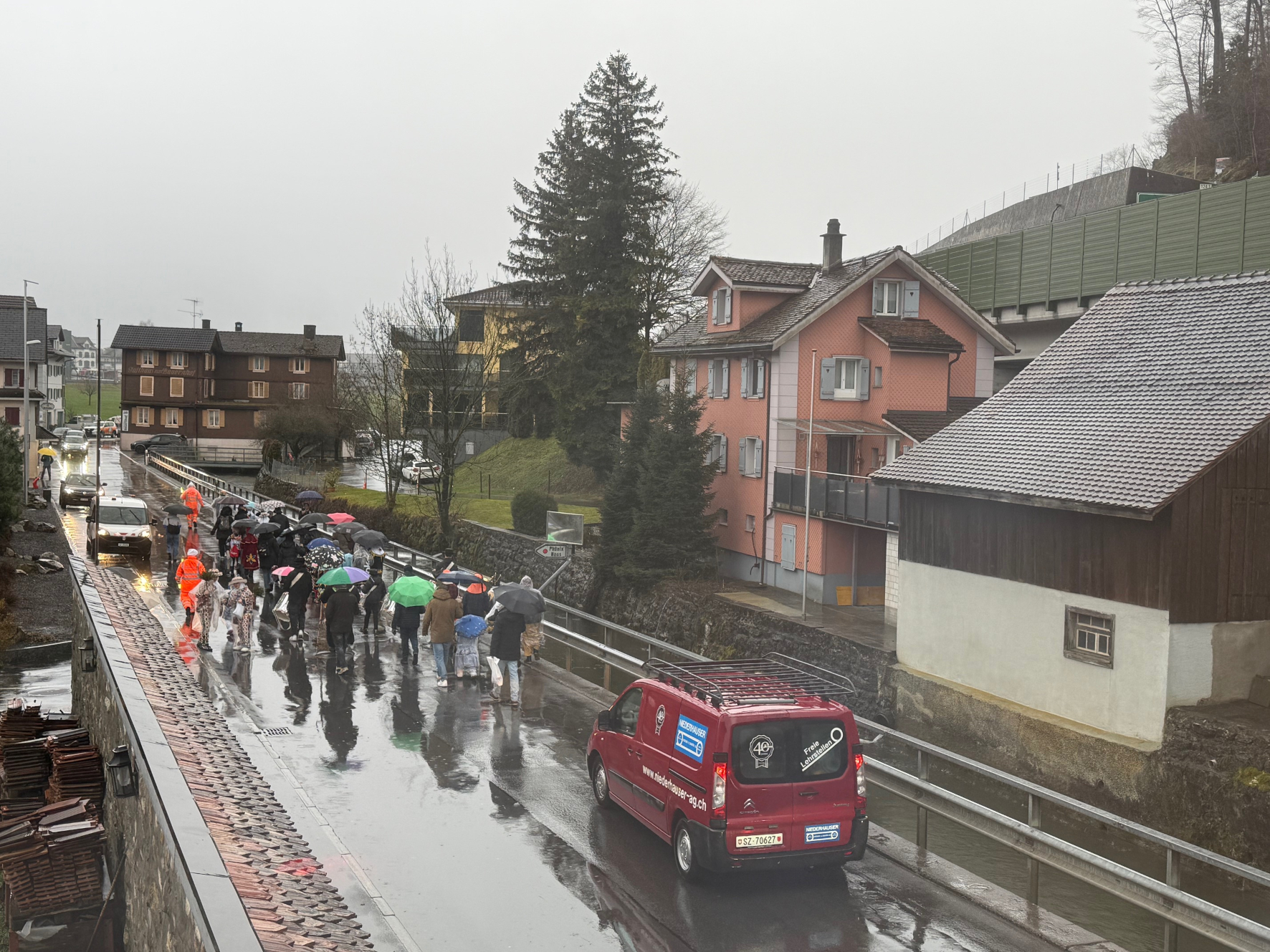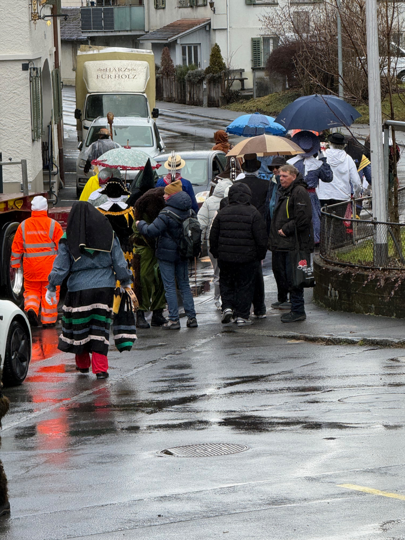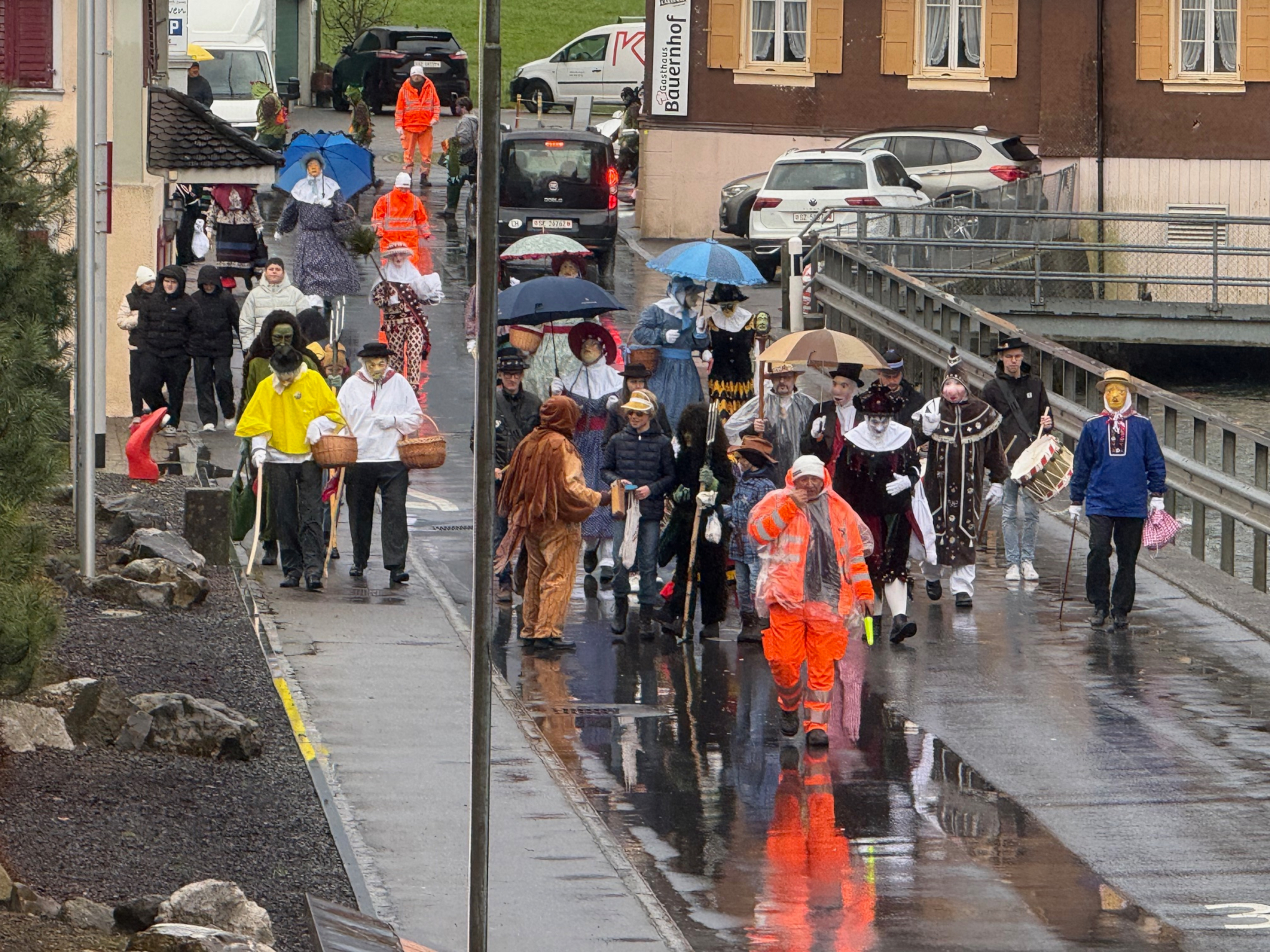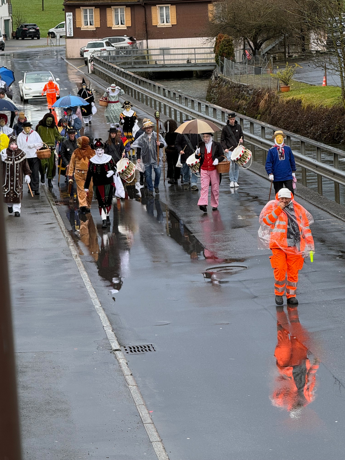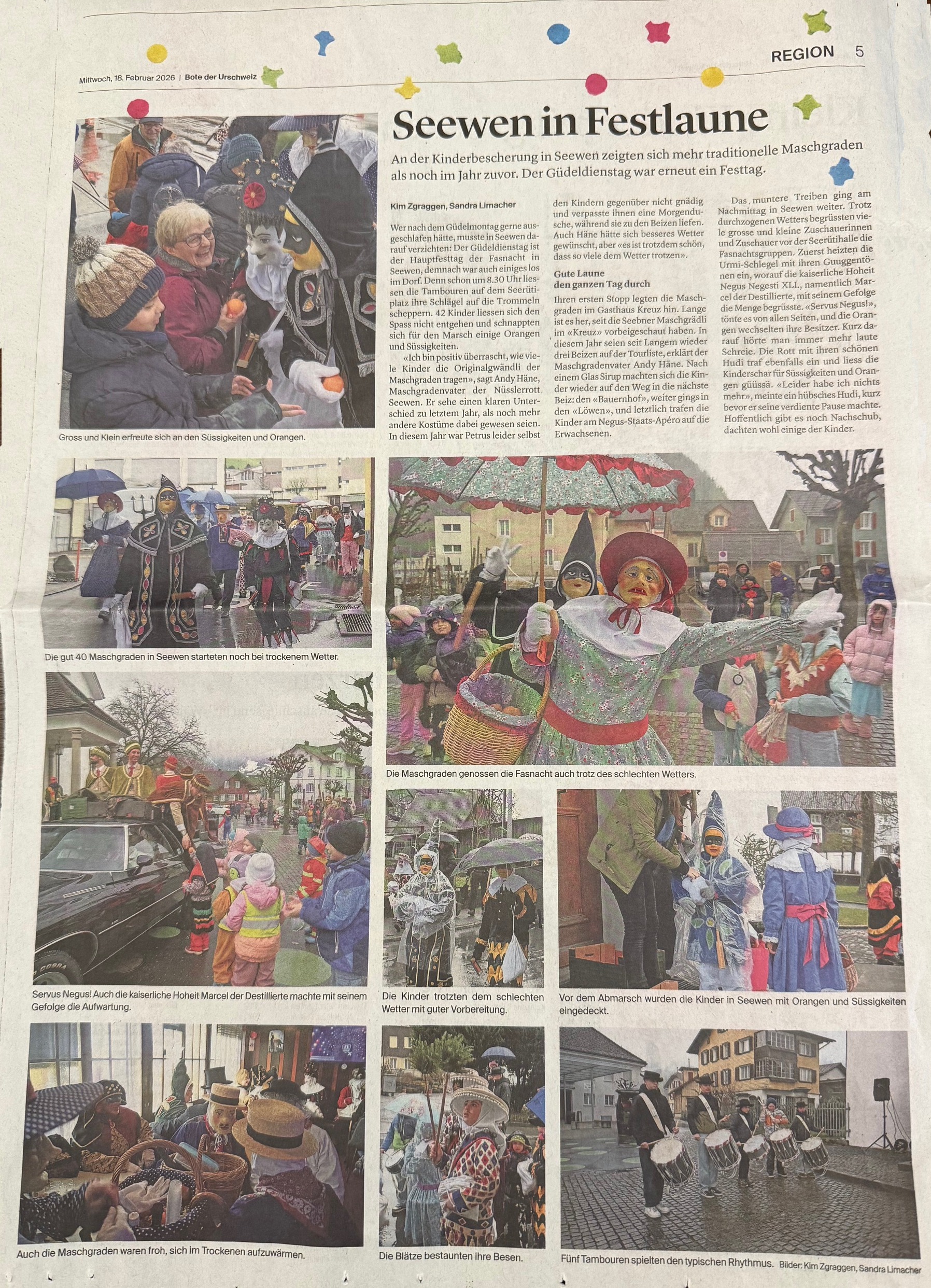 p. Ja, es war mehr als 'misslich', das Wetter zwischen dem Jubiläumsumzug aus Anlass des 90jährigen Bestehens der Negus-Gesellschaft von Addis-a-Seeba am Samstag (Valentinstag 2026) und dem gestrigen Staatsfeiertag (Güdeldienstag). Die Stimmung war einzig unter den hartgesottensten Fasnächtlern und den Schankhausbesuchern optimal. Das Besucheraufkommen war denn auch nicht so gross, die Maschgraden bekamen ihre Orangen fast nicht los...