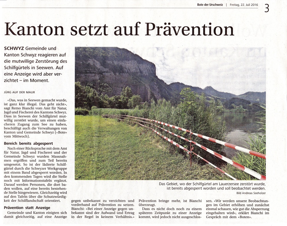 p. Er leistet nicht nur einen wichtigen Beitrag zur Stabilisierung der Uferzone vor Erosion, sondern ist auch ein wichtiger Lebensraum für Vogel- und Fischartenarten. Gemeint ist der Schilfgürtel, der sich über weite Teile entlang von Uferzonen entfaltet. Der Bedeutung dieser Zone zwischen See und Ufer bewusst haben in den letzten Jahren verschiedene Vereine gegen das Verdrängen des Schilfes vor allem auf Seebner Seeseite gekämpft. Der Korberclub Lauerzersee wie auch der Quartierverein Unterseewen traten gegen die Verbuschung an und entfernten grünes und totes Gehölz, welches dem Schilf zusetzte. Dies alles in hunderten von Stunden Fronarbeit. Ueber die vergangenen zehn Jahre ist so ein fast durchgehendes Schilfband zwischen dem See-Ausfluss beim ‚Barcarola‘ auf der nord-östlichen Seeseite entstanden – unterbrochen einzig vom Badi-Gelände. Doch was letzten Sonntag geschah, das schmerzt und ist ein Hammerschlag auf die ehrenamtlichen Bemühungen der Naturfreunde. So haben im Abschnitt ‚Seemattli‘ zahlreiche ‚Nicht-Einheimische‘ auf der Wiese entlang des Sees ihre Badeutensilien ausgebreitet und einige fröhliche Stunden verbracht. Das an sich ist nicht strafbar. Dass sie aber zwecks freiem Zugang zum See an zahlreichen Stellen einfach das Schilf abschnitten und so Schneisen in den Schilfgürtel schlugen, das ist mehr als verwerflich! Denn ist erst einmal ein solcher ‚Pfad‘ ins Schilf geschlagen, werden die Röhrlinge schnell zertrampelt. Dann braucht es Jahre, bis das Schilf wieder seine ursprüngliche Grösse erreicht hat. Gestoppt werden kann solches Tun einzig, indem an diesen sensiblen Stellen klar sichtbare Info- bzw. Verbotstafeln aufgestellt werden mit Piktogrammen und verdeutlicht in möglichst vielen Sprachen. Für die Uferzone zuständig ist die jeweilige Gemeinde, das stehende Gewässer ist Eigentum des Kantons.