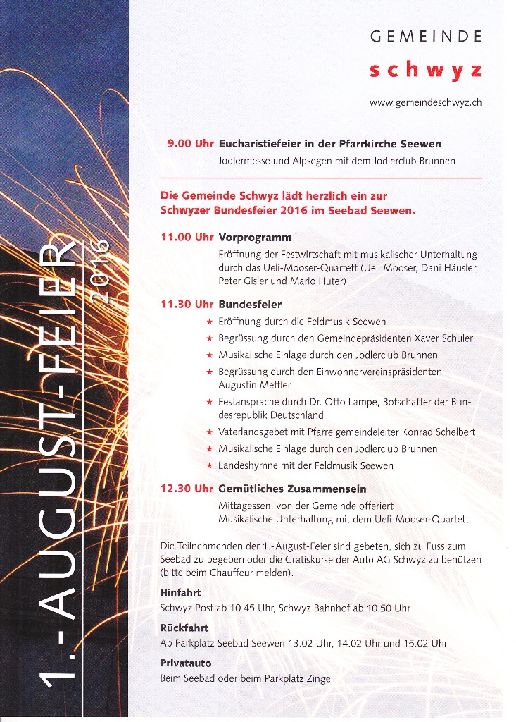 Zwei Tage später, am 1. August 2016, lädt die Gemeinde zur offiziellen Feier zum Bundesfeiertag ein. Das Programm startet um 11 Uhr. Als einer der Höhepunkte wird Dr. Otto Lampe, der Botschafter Deutschlands in der Schweiz, die Festansprache halten. Ab 12.30 Uhr offeriert die Gemeinde ein ‚Gratis-Zmittag‘. Details sind einem Flugblatt zu entnehmen, das ebenfalls in alle Haushaltungen verteilt wurde. Weitere Infos: www.gemeindeschwyz.ch
