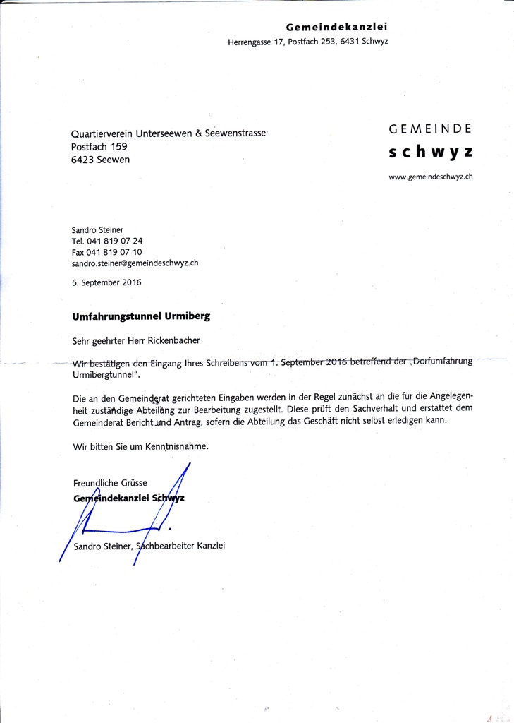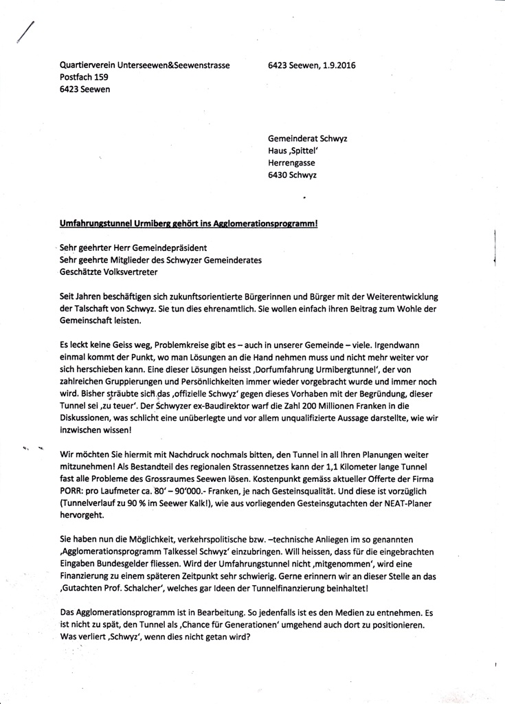 Dem örtlichen Quartierverein Unterseewen&Seewenstrasse ist ebenfalls zu Ohren gekommen, dass Bundesgelder für Infrastrukturprojekte fliessen – sofern sie beantragt werden. Er hat daher beim Gemeinderat Schwyz angeklopft und ihn gebeten, den Tunnel im Programm mitzunehmen. Doch die Antwort, die der Quartierverein am 26. September 2016 von der Geschäftsstelle Agglomerationsprogramm erhielt, die war ernüchternd. Ihm wurde mitgeteilt, dass der ‚Umfahrungstunnel‘ nicht mehr im Richtplan aufgelistet sei und daher nicht im Agglomerationsprogramm mitgeführt werde…