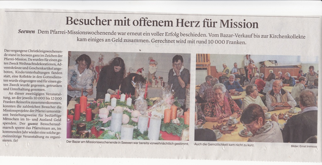 p. Jährlich im November lädt die Pfarrei Seewen zum Missionswochenende ein. So war es auch dieses Jahr. Am 19. und 20. November strömte das Volk zu Hunderten in und unter die Pfarrkirche, um am breiten Programm teilzuhaben. Gestartet wurde das solidarische Engagement der Pfarrei zugunsten von Menschen am Rande der Gesellschaft am Samstag-Mittag mit der Eröffnung des Bazar durch die Werkgruppe. Diese verkaufte eine grosse Fülle an Nutz- und Ziergegenständen an eine kaufwillige Kundschaft. Fast gleichzeitig wurde das Spiel- und Unterhaltungsprogramm für Kinder und Jugendliche gestartet. Parallel dazu wurde in der Kaffeestube der Durst bekämpft, begleitet zu Musik von Edy von Euw und Res Ulrich. Der Sonntag startete mit einer Jodlermesse, welche vom Jodlerklub ‚Edelweiss‘ aus Ibach umrahmt wurde. Im Anschluss daran lockten wiederum die Kaffeestube und der Bazar, die aber beide im Schatten des grossen Pfarrei-Mittagessens standen. Ueber 100 Personen aus nah und auch aus fern nämlich generierten das Pfarrei-Angebot und führten sich ein feines Menu zu Gemüte. Im Anschluss daran begann der grosse Lottomatch mit vielen sehr schönen Preisen. Auch hier wiederum war gross und klein ‚voll bei der Sache’; fast niemand musste ganz leer ausgehen. Wer keine Spielernatur war, der amüsierte sich währenddessen in der Kaffeestube bei einem Schwatz zu Murers Werni Klängen oder nutzte die andern vielen Vergnügungsmöglichkeiten. Sukzessive löste sich gegen Abend das Pfarreifest auf. Geblieben sind viele Erinnerungen und einen schönen Batzen für Menschen in Not.