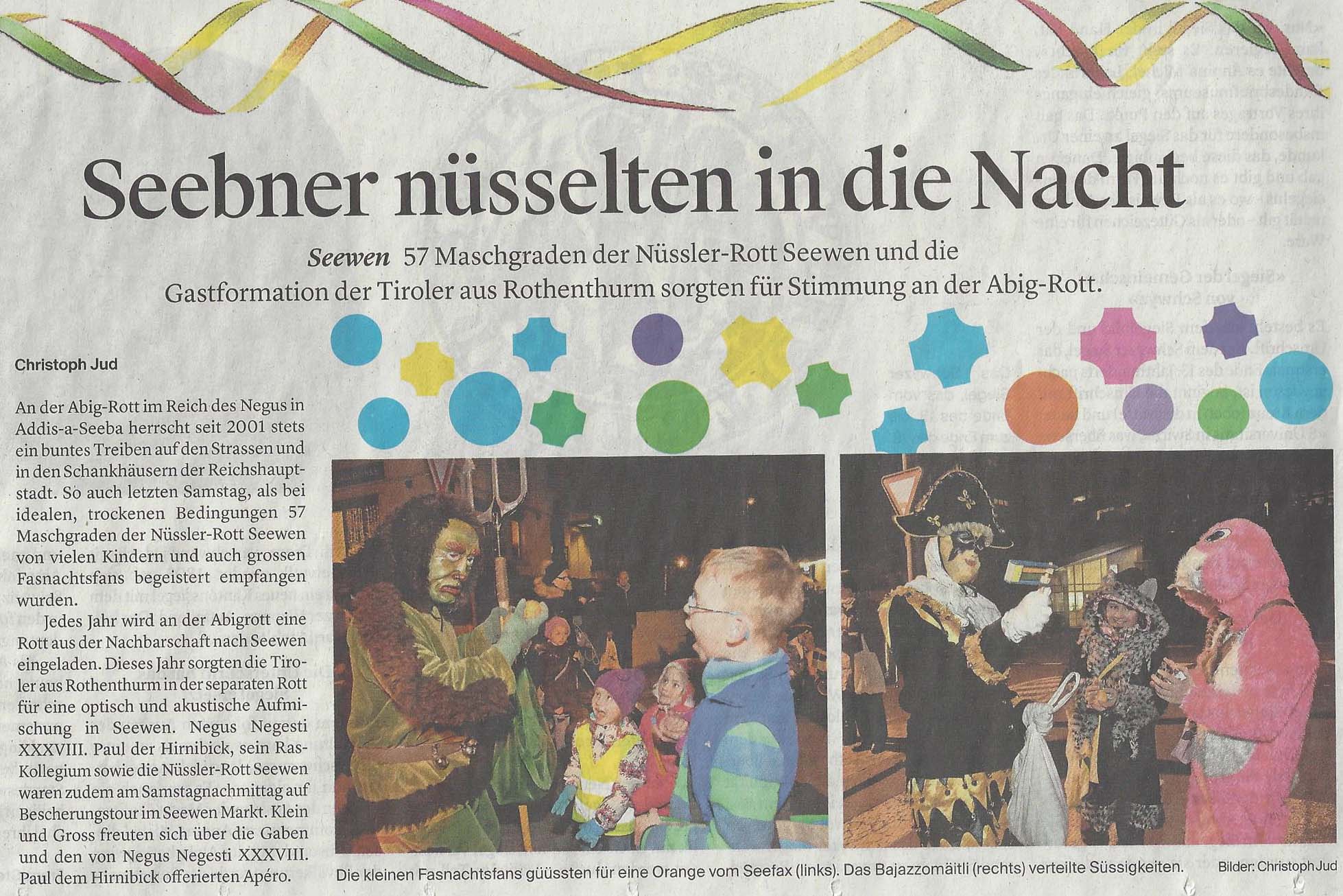 p. So soll es an der Fasnacht sein: ausgelassen und fröhlich! Zwei der Fasnacht tragenden Gruppierungen in Addis-a-Seeba - die Negusgesellschaft und die Nüssler-Rott Seewen -feierten am Samstag (25.2.2017) einen ersten grossen Auftritt. Das Detailhandelsunternehmen Coop lud die älteste Seebner Fasnachtsvereinigung zu einer Präsentation im SeewenMarkt ein. Die Einladung wurde gerne angenommen, eine Grosszahl des Ras-Kollegiums stand dem Publikum für Auskünfte jeglicher Art zur Verfügung. Den Blick auf sich aber zogen nicht die Mannen in den sandfarbenen Gewändern, sondern die Staatskarosse, die hochglänzend bei der Haupteingangspforte stand… Wenige Stunden später folgte dann der ‘Startschuss’ der andern Fasnachtsgruppierung zur Abigrott. Eine grosse Zahl Maschgraden in den sechs Original-Fasnachtsgwändli machte sich in Begleitung von Tambouren auf den Parkour durch Addis-a-Seeba und intrigierte in den Schankhäusern auf ‘Teufel-komm-raus’. Auch unterwegs war die Gastgruppe ‘Tiroler Rothenthurm’, dann Gruppen von Hühnern, Hexen, Köchen, Bäckern, Vampiren und Wasweissichnochwas. Um Mitternacht beruhigte sich das Treiben in den vielen Schankhäusern ein wenig, weil sich der Grossteil der Fasnächtler in die Mehrzweckhalle ‘Seerüti’ begab, um dort den Abend ausklingen zu lassen.