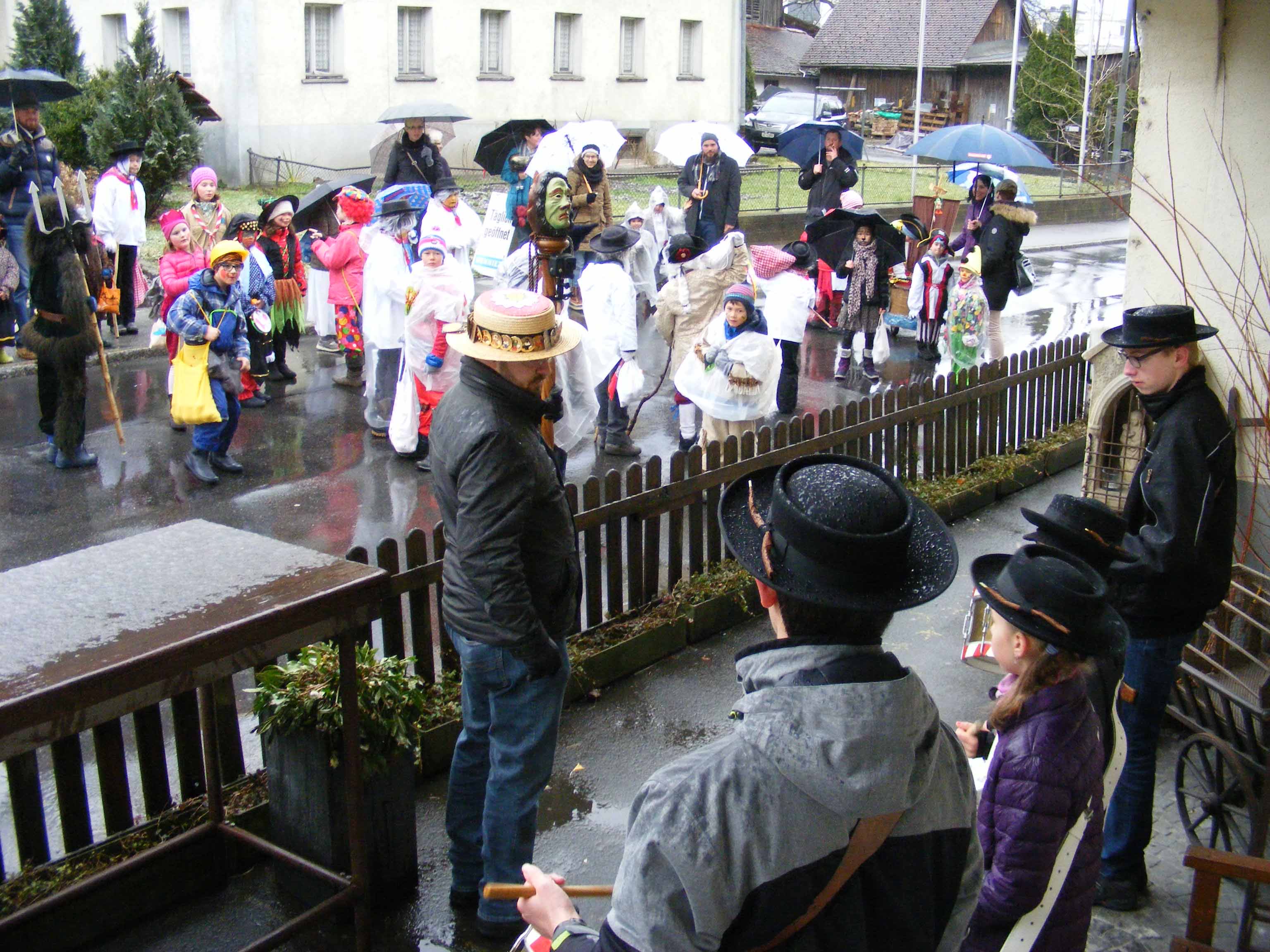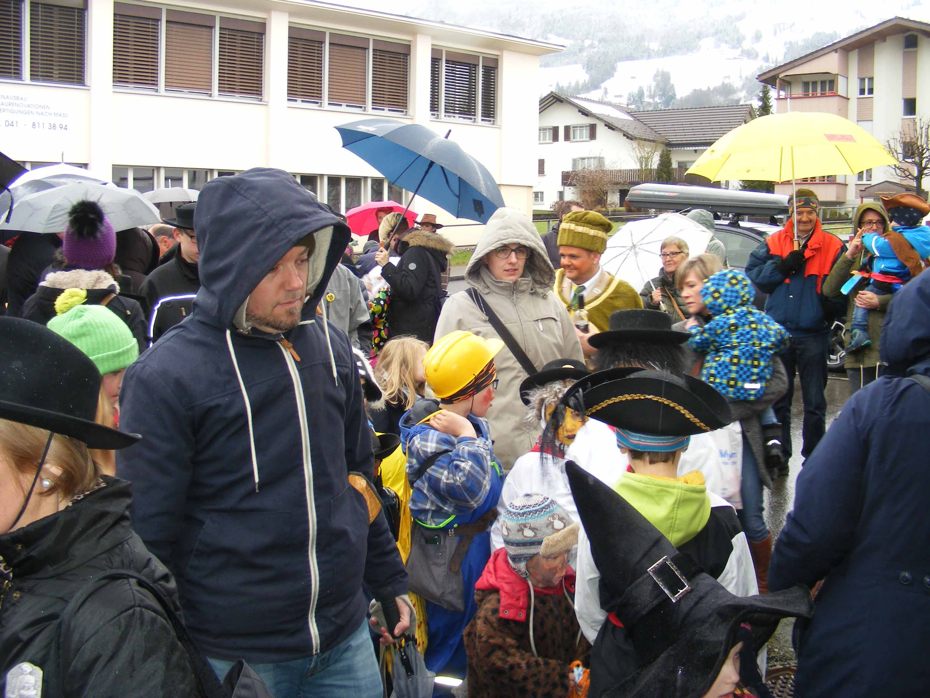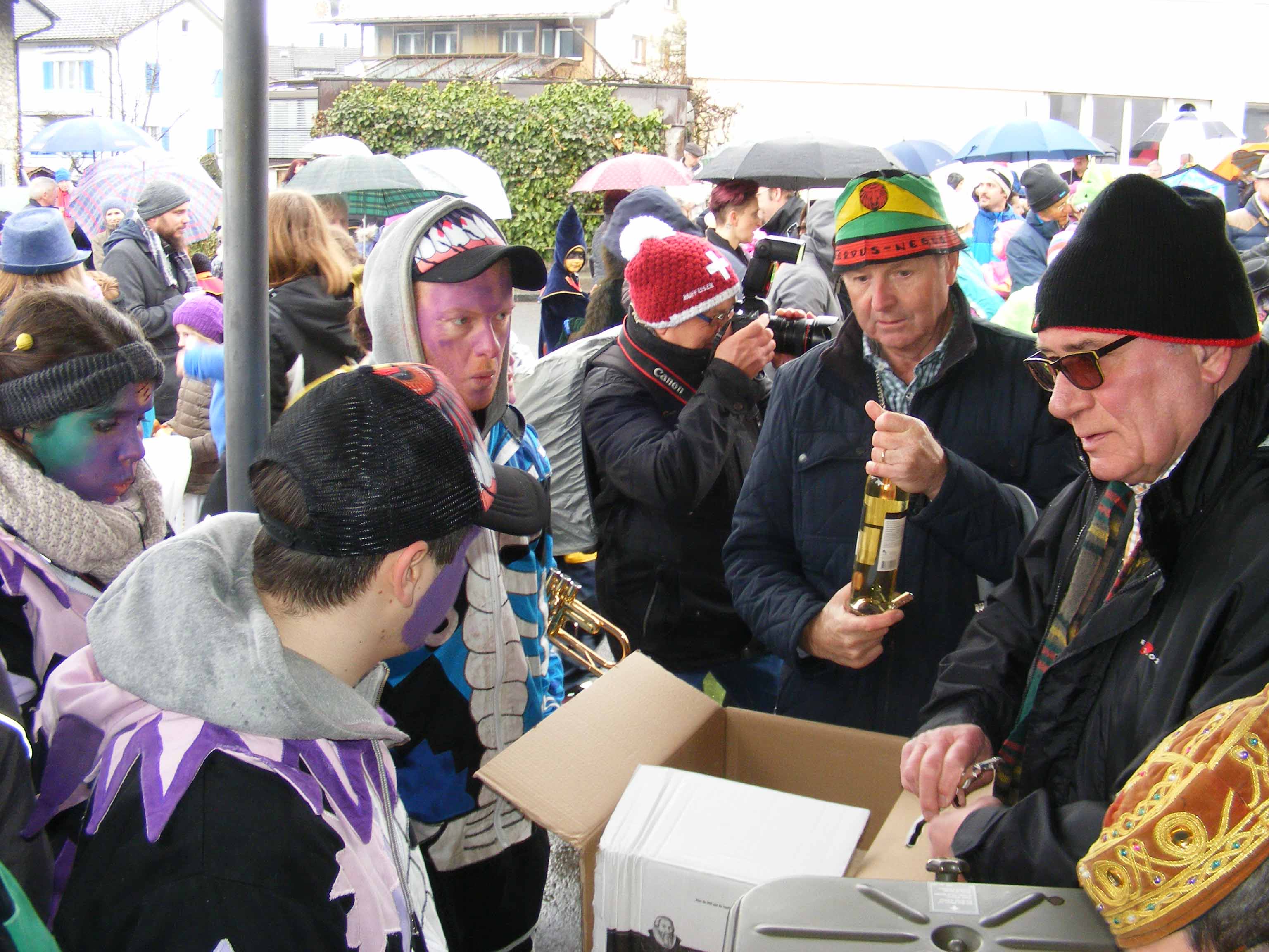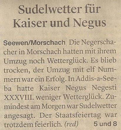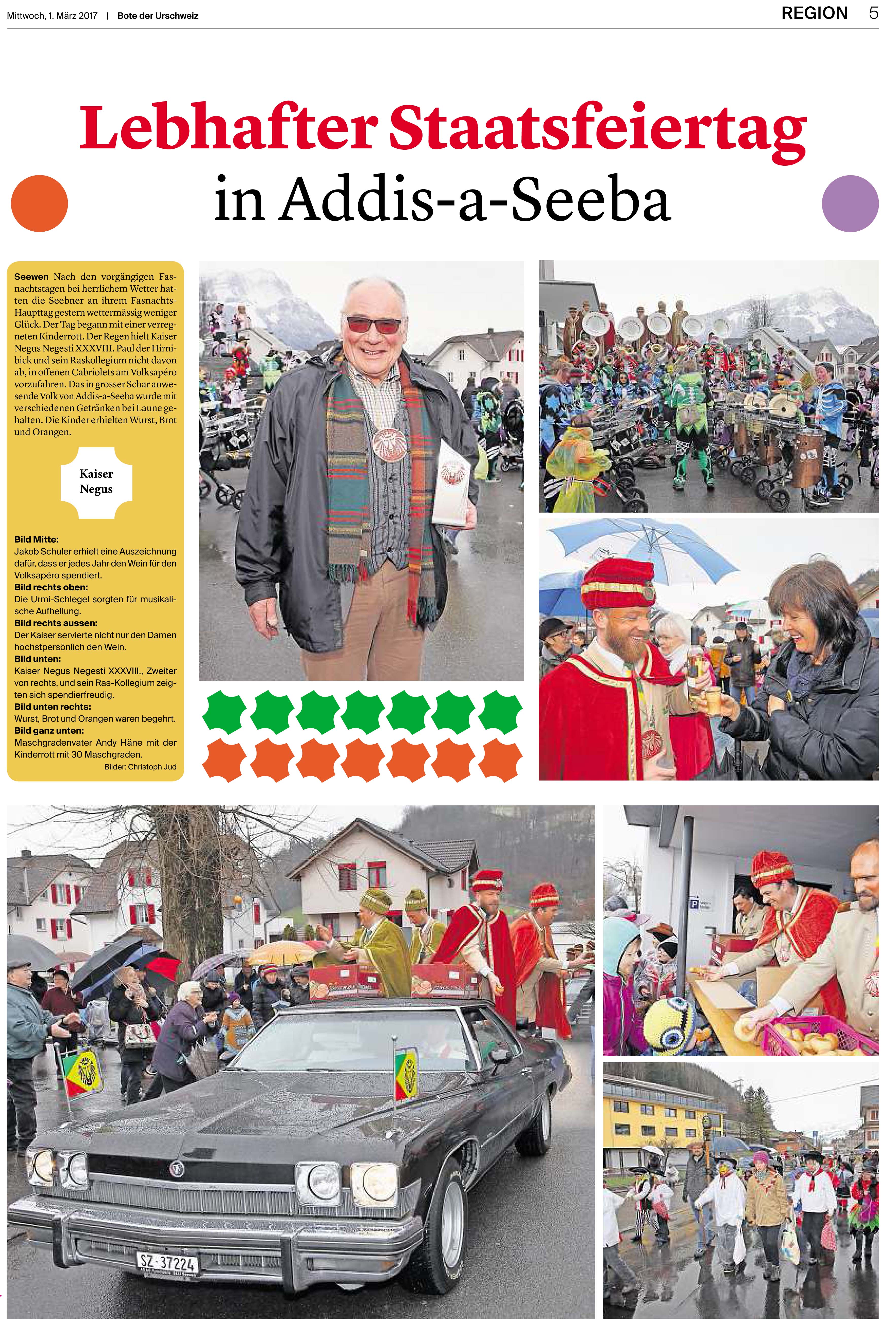 p. Der Staatsfeiertag 2017 in Addis-a-Seeba - der Güdeldienstag – gilt als Höhepunkt und gleichzeitig Abschluss der Fasnachtszeit am Fusse des Urmibergs. Es war ein Tag voller Abwechslung, auch witterungsmässig. Morgens verregnete es die kleinsten Maschgrädli, kurz nach Mittag lächelte die Sonne die ‘grossen Maschgraden’ an, bis dann um 16 Uhr ein Sturmtief der fröhlich-ausgelassenen Stimmung auf dem Seerütiplatz einen Schlussstrich setzte. Begonnen hatte die Strassenfasnacht am Fusse des Monte Urmibergs mit dem Umzug der Kinderrott durch Addis-a-Seeba. Mit rund 30 Maschgrädli war das Grüppli etwa halb so gross wie letztes Jahr. Begleitet von Nieselregen zogen die kleinen Fasnächtler - viele von ihnen in Begleitung ihrer Eltern - via Unterseewen zur Pfarrkirche, dem Ausgangspunkt zurück. Dann, kurz nach 10 Uhr, fuhren die zwei Staatskarossen auf den Vorplatz ebengenannter Kirche vor. Das zahlreich aufmarschierte Volk huldigte dem Kaiser Negus Negesti XXXVIII., Paul der Hirnibick. Bei dieser Gelegenheit ergriff der Kanzler das Wort und ehrte drei Neguaner für ihren Beitrag zugunsten des Staates: Köbi Schuler für das Sponsoring des Empfang-Apéros, ‘Bauernhof’-Wirt Roli Müller für die jährliche Aufnahme der Kinderrott und ‘Kreuz’-Wirt Peter Rickenbacher für sein Doppel-Engagement ‘Homepage-Dorfzeitung’ und Kinderrott-Bewirtung. Als Dank wurde ihnen ein ‘Negus-Oskar’ verabreicht. Nach den Ehrungen kamen aus allen Landesecken die Maschgraden und Gugger auf den Platz und stellten sich in Szene. Der Kaiser seinerseits bedankte sich via Sprecher für so viel Wertschätzung. Als Geste für so viel Aufmerksamkeit revanchierte er sich seinerseits mit einem Apéro bzw. der beliebten ‚Bescherung’ (Wurst, Brot, Orangen). Nach der Mittagsruhe startete die ‘grosse Maschgraden’-Rott anschliessend zu ihrer Bescherungstour. Ueber 30 ‚hartgesottene’ und wetterfeste Nüssler besuchten Schankhaus um Schankhaus, bevor nochmals alle Maschgraden und die Guuggen um 16 Uhr vor der Alten Kathedrale zusammen trafen. Wie bestellt, folgte just in diesem Moment der abrupte Wetterumschlag…