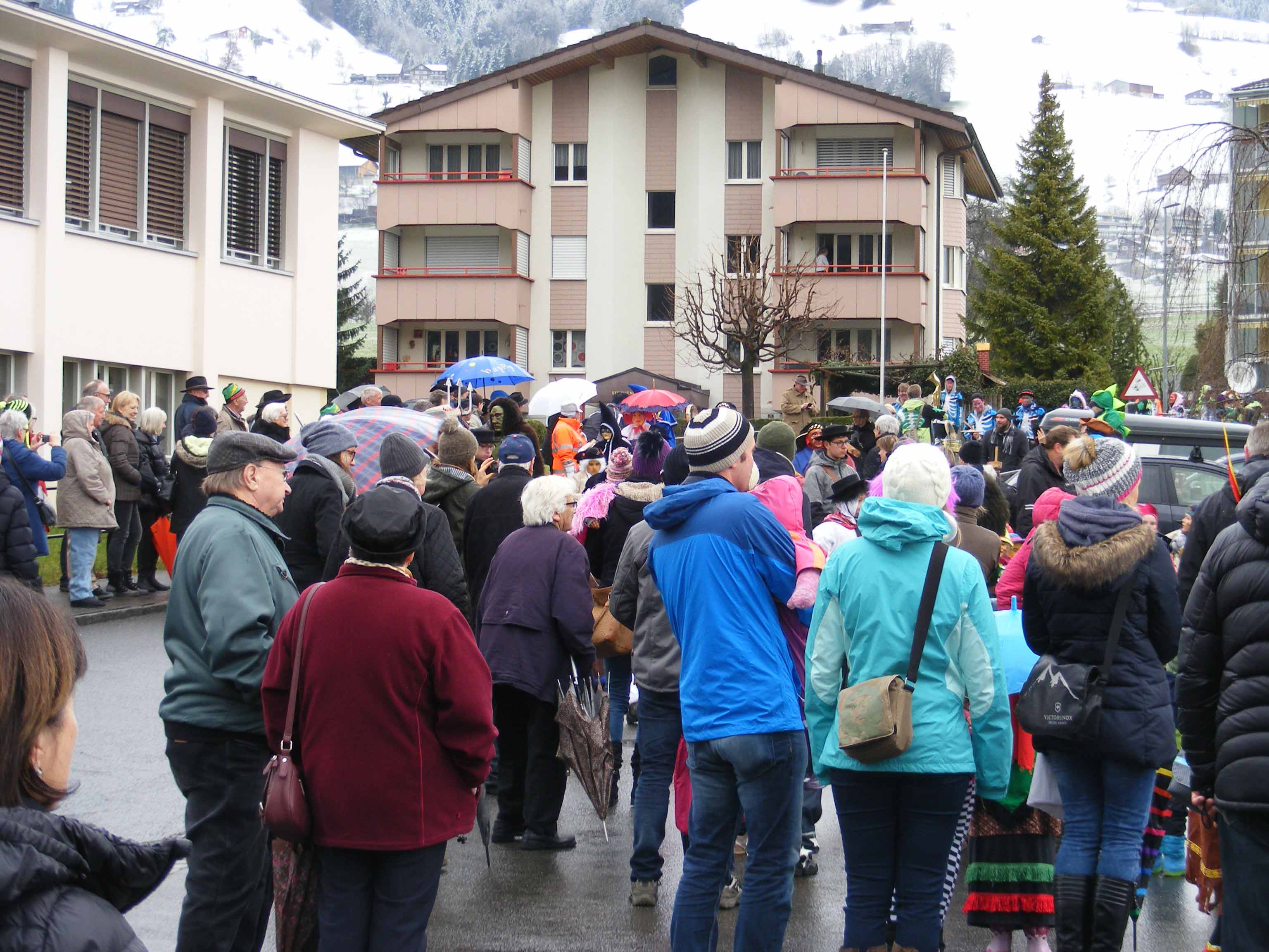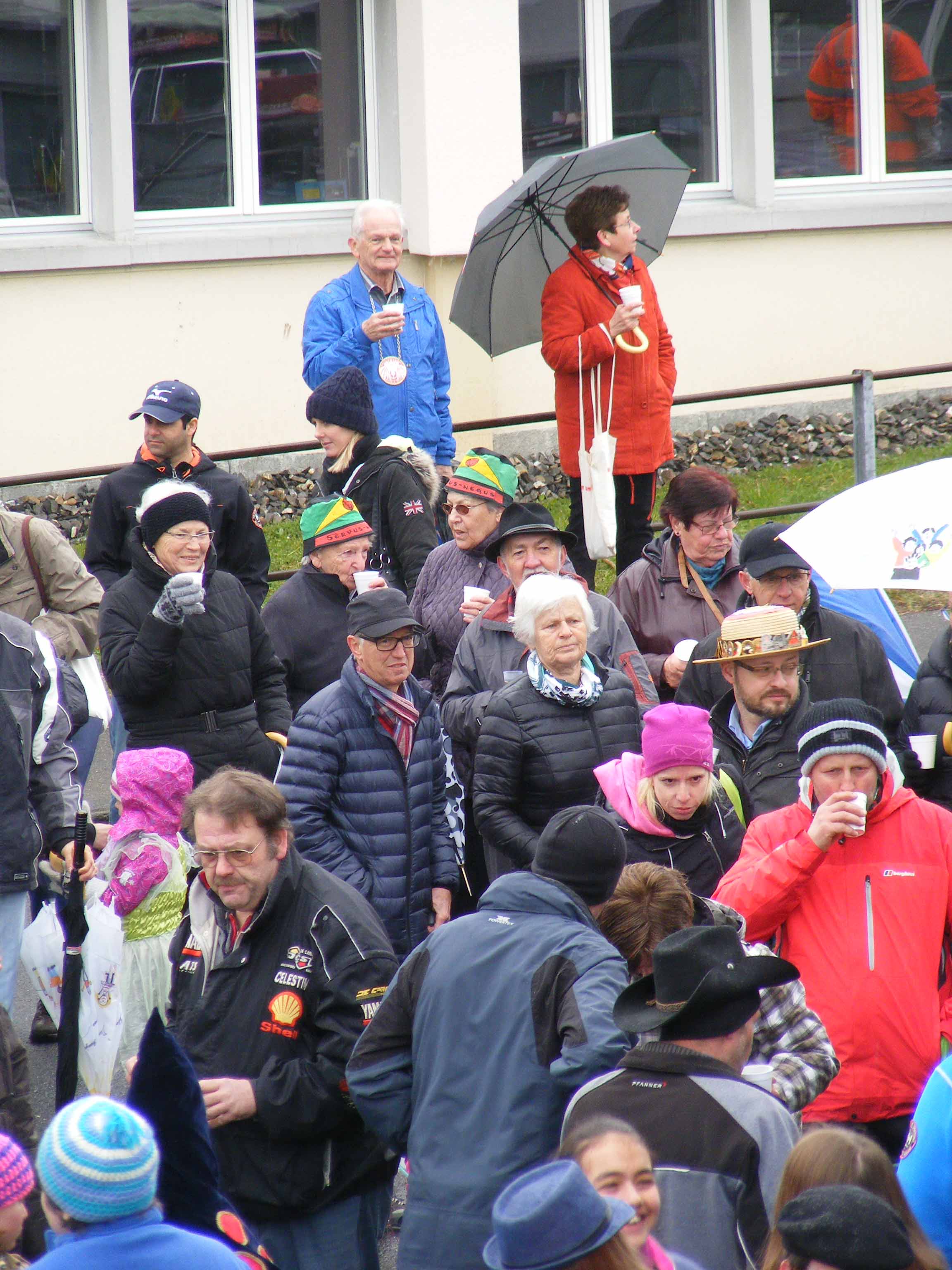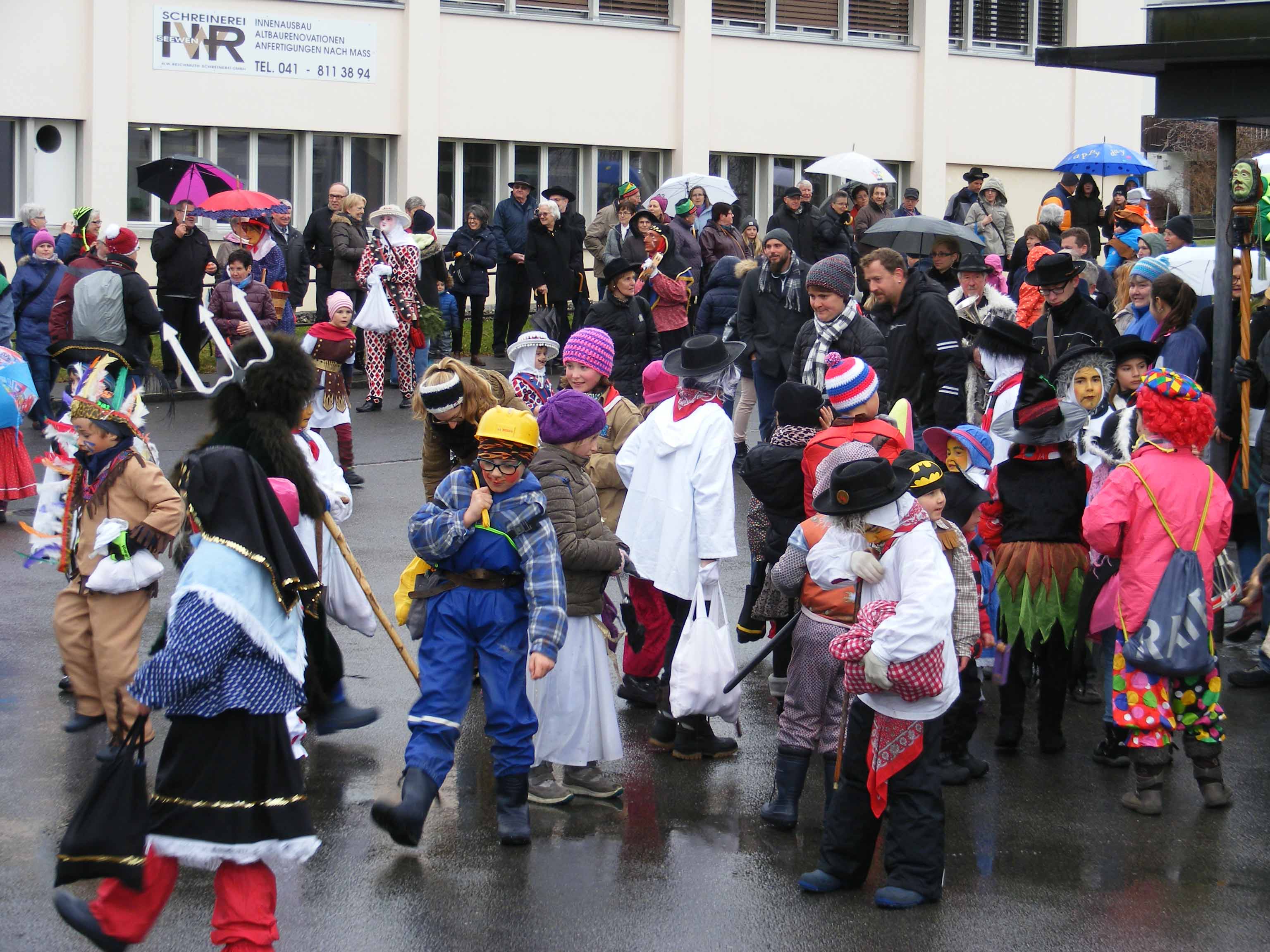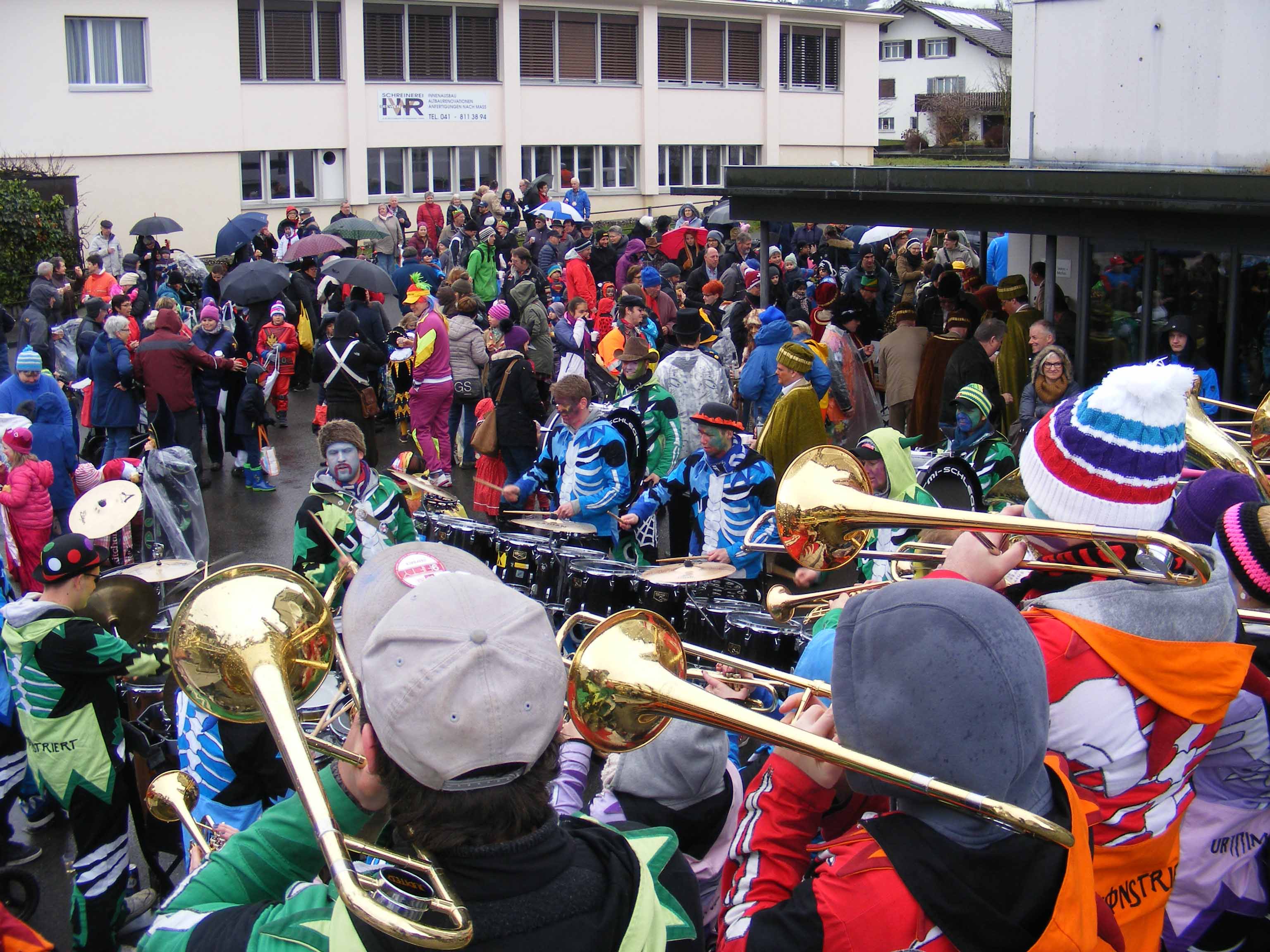 p. Der Staatsfeiertag 2017 in Addis-a-Seeba - der Güdeldienstag – gilt als Höhepunkt und gleichzeitig Abschluss der Fasnachtszeit am Fusse des Urmibergs. Es war ein Tag voller Abwechslung, auch witterungsmässig. Morgens verregnete es die kleinsten Maschgrädli, kurz nach Mittag lächelte die Sonne die ‘grossen Maschgraden’ an, bis dann um 16 Uhr ein Sturmtief der fröhlich-ausgelassenen Stimmung auf dem Seerütiplatz einen Schlussstrich setzte. Begonnen hatte die Strassenfasnacht am Fusse des Monte Urmibergs mit dem Umzug der Kinderrott durch Addis-a-Seeba. Mit rund 30 Maschgrädli war das Grüppli etwa halb so gross wie letztes Jahr. Begleitet von Nieselregen zogen die kleinen Fasnächtler - viele von ihnen in Begleitung ihrer Eltern - via Unterseewen zur Pfarrkirche, dem Ausgangspunkt zurück. Dann, kurz nach 10 Uhr, fuhren die zwei Staatskarossen auf den Vorplatz ebengenannter Kirche vor. Das zahlreich aufmarschierte Volk huldigte dem Kaiser Negus Negesti XXXVIII., Paul der Hirnibick. Bei dieser Gelegenheit ergriff der Kanzler das Wort und ehrte drei Neguaner für ihren Beitrag zugunsten des Staates: Köbi Schuler für das Sponsoring des Empfang-Apéros, ‘Bauernhof’-Wirt Roli Müller für die jährliche Aufnahme der Kinderrott und ‘Kreuz’-Wirt Peter Rickenbacher für sein Doppel-Engagement ‘Homepage-Dorfzeitung’ und Kinderrott-Bewirtung. Als Dank wurde ihnen ein ‘Negus-Oskar’ verabreicht. Nach den Ehrungen kamen aus allen Landesecken die Maschgraden und Gugger auf den Platz und stellten sich in Szene. Der Kaiser seinerseits bedankte sich via Sprecher für so viel Wertschätzung. Als Geste für so viel Aufmerksamkeit revanchierte er sich seinerseits mit einem Apéro bzw. der beliebten ‚Bescherung’ (Wurst, Brot, Orangen). Nach der Mittagsruhe startete die ‘grosse Maschgraden’-Rott anschliessend zu ihrer Bescherungstour. Ueber 30 ‚hartgesottene’ und wetterfeste Nüssler besuchten Schankhaus um Schankhaus, bevor nochmals alle Maschgraden und die Guuggen um 16 Uhr vor der Alten Kathedrale zusammen trafen. Wie bestellt, folgte just in diesem Moment der abrupte Wetterumschlag…