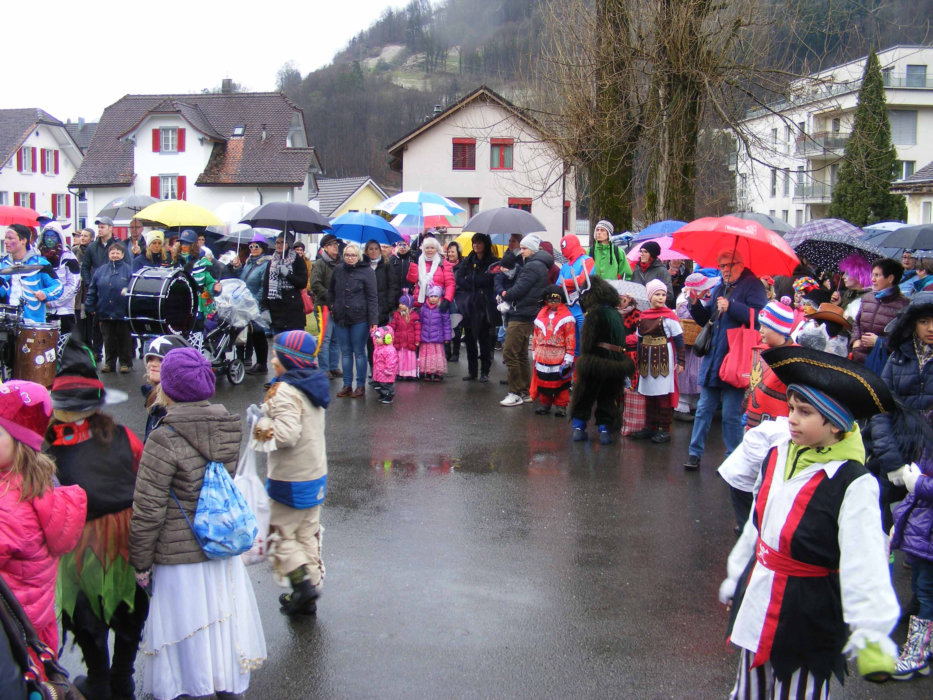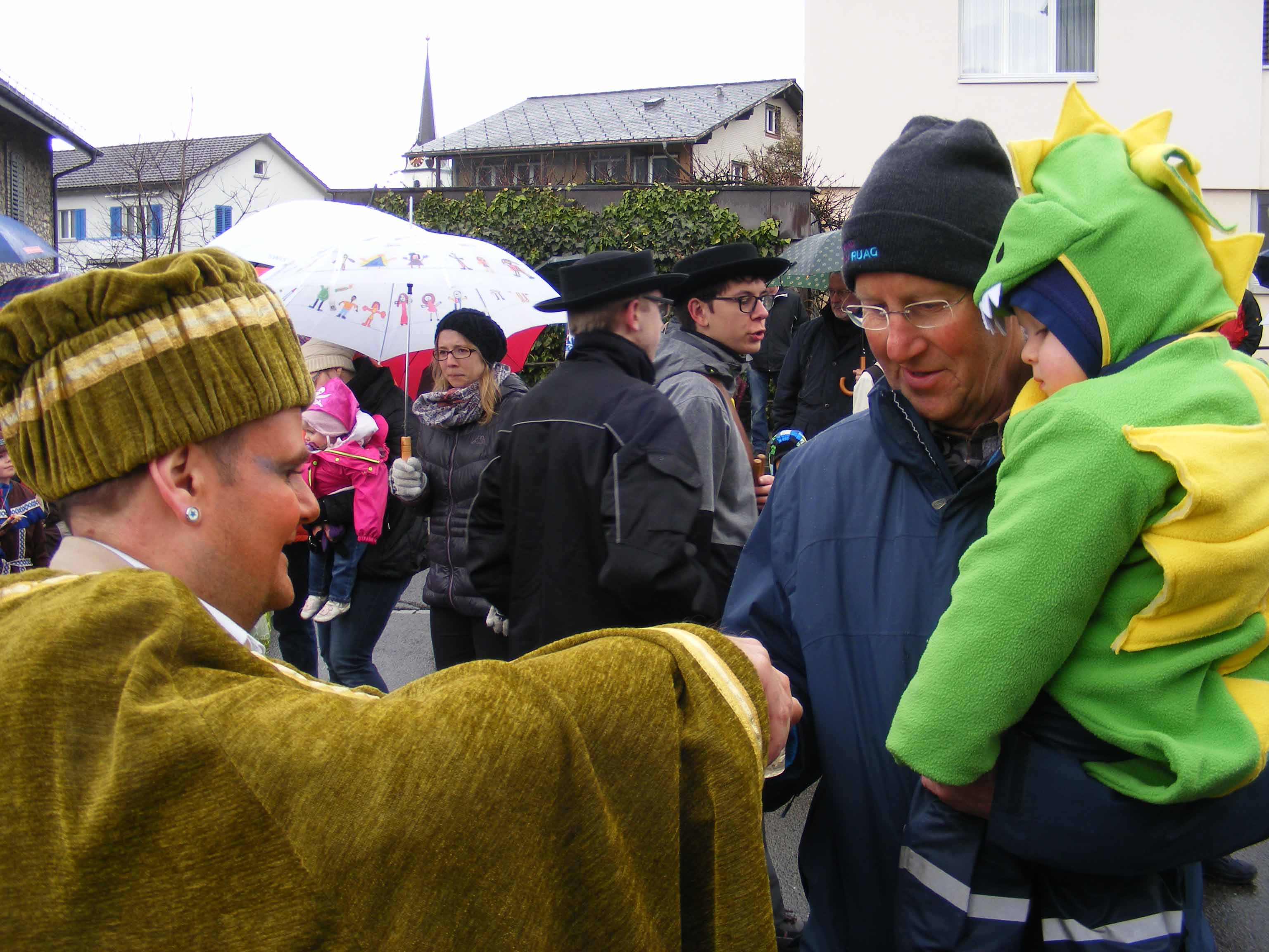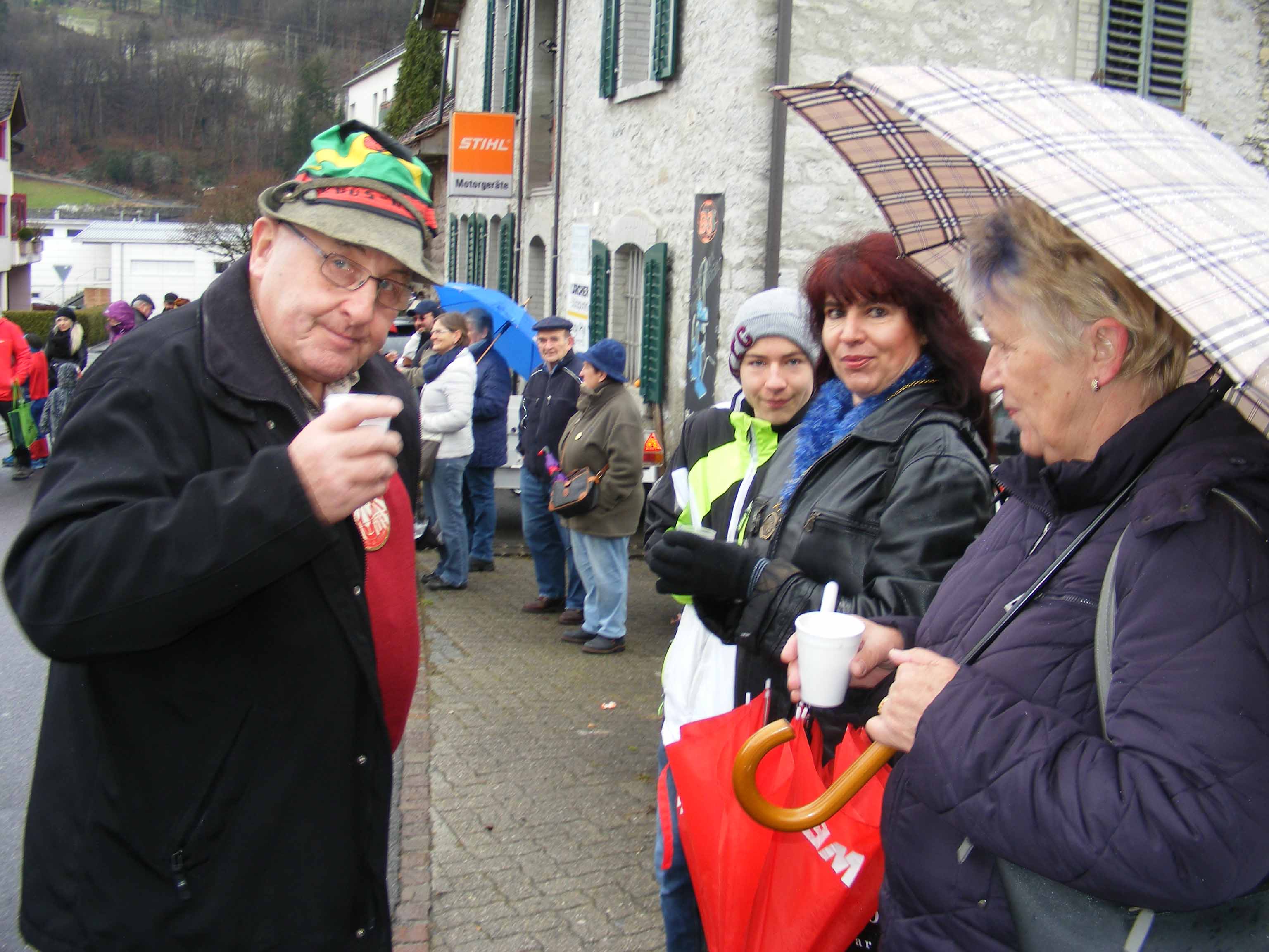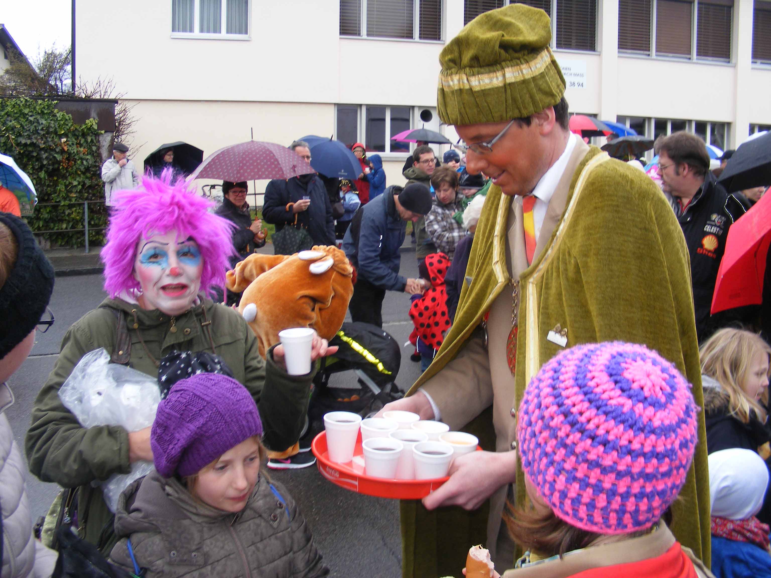 p. Der Staatsfeiertag 2017 in Addis-a-Seeba - der Güdeldienstag – gilt als Höhepunkt und gleichzeitig Abschluss der Fasnachtszeit am Fusse des Urmibergs. Es war ein Tag voller Abwechslung, auch witterungsmässig. Morgens verregnete es die kleinsten Maschgrädli, kurz nach Mittag lächelte die Sonne die ‘grossen Maschgraden’ an, bis dann um 16 Uhr ein Sturmtief der fröhlich-ausgelassenen Stimmung auf dem Seerütiplatz einen Schlussstrich setzte. Begonnen hatte die Strassenfasnacht am Fusse des Monte Urmibergs mit dem Umzug der Kinderrott durch Addis-a-Seeba. Mit rund 30 Maschgrädli war das Grüppli etwa halb so gross wie letztes Jahr. Begleitet von Nieselregen zogen die kleinen Fasnächtler - viele von ihnen in Begleitung ihrer Eltern - via Unterseewen zur Pfarrkirche, dem Ausgangspunkt zurück. Dann, kurz nach 10 Uhr, fuhren die zwei Staatskarossen auf den Vorplatz ebengenannter Kirche vor. Das zahlreich aufmarschierte Volk huldigte dem Kaiser Negus Negesti XXXVIII., Paul der Hirnibick. Bei dieser Gelegenheit ergriff der Kanzler das Wort und ehrte drei Neguaner für ihren Beitrag zugunsten des Staates: Köbi Schuler für das Sponsoring des Empfang-Apéros, ‘Bauernhof’-Wirt Roli Müller für die jährliche Aufnahme der Kinderrott und ‘Kreuz’-Wirt Peter Rickenbacher für sein Doppel-Engagement ‘Homepage-Dorfzeitung’ und Kinderrott-Bewirtung. Als Dank wurde ihnen ein ‘Negus-Oskar’ verabreicht. Nach den Ehrungen kamen aus allen Landesecken die Maschgraden und Gugger auf den Platz und stellten sich in Szene. Der Kaiser seinerseits bedankte sich via Sprecher für so viel Wertschätzung. Als Geste für so viel Aufmerksamkeit revanchierte er sich seinerseits mit einem Apéro bzw. der beliebten ‚Bescherung’ (Wurst, Brot, Orangen). Nach der Mittagsruhe startete die ‘grosse Maschgraden’-Rott anschliessend zu ihrer Bescherungstour. Ueber 30 ‚hartgesottene’ und wetterfeste Nüssler besuchten Schankhaus um Schankhaus, bevor nochmals alle Maschgraden und die Guuggen um 16 Uhr vor der Alten Kathedrale zusammen trafen. Wie bestellt, folgte just in diesem Moment der abrupte Wetterumschlag…