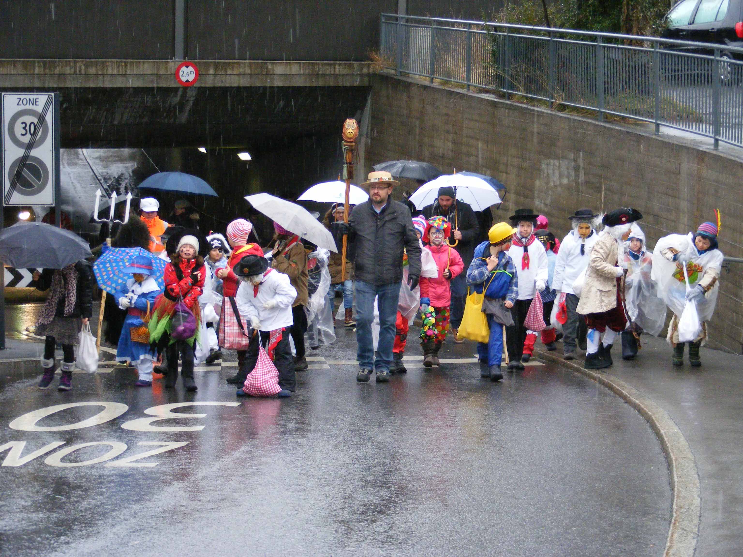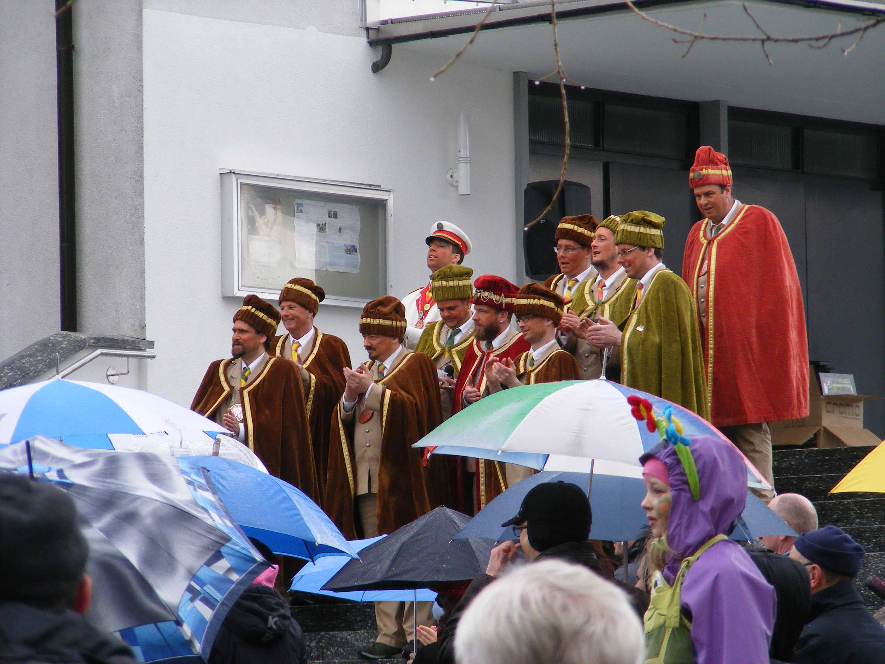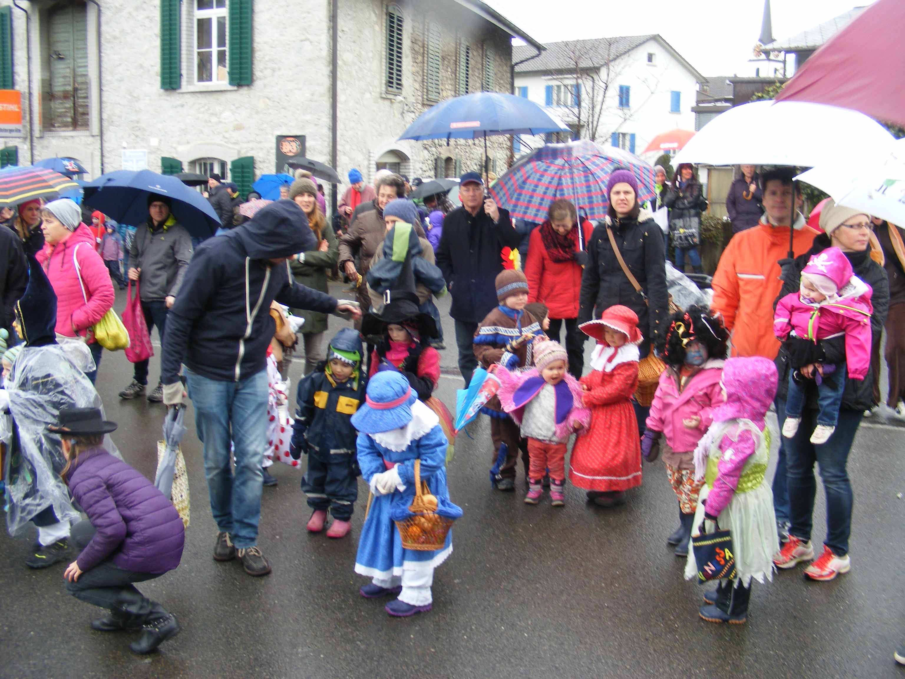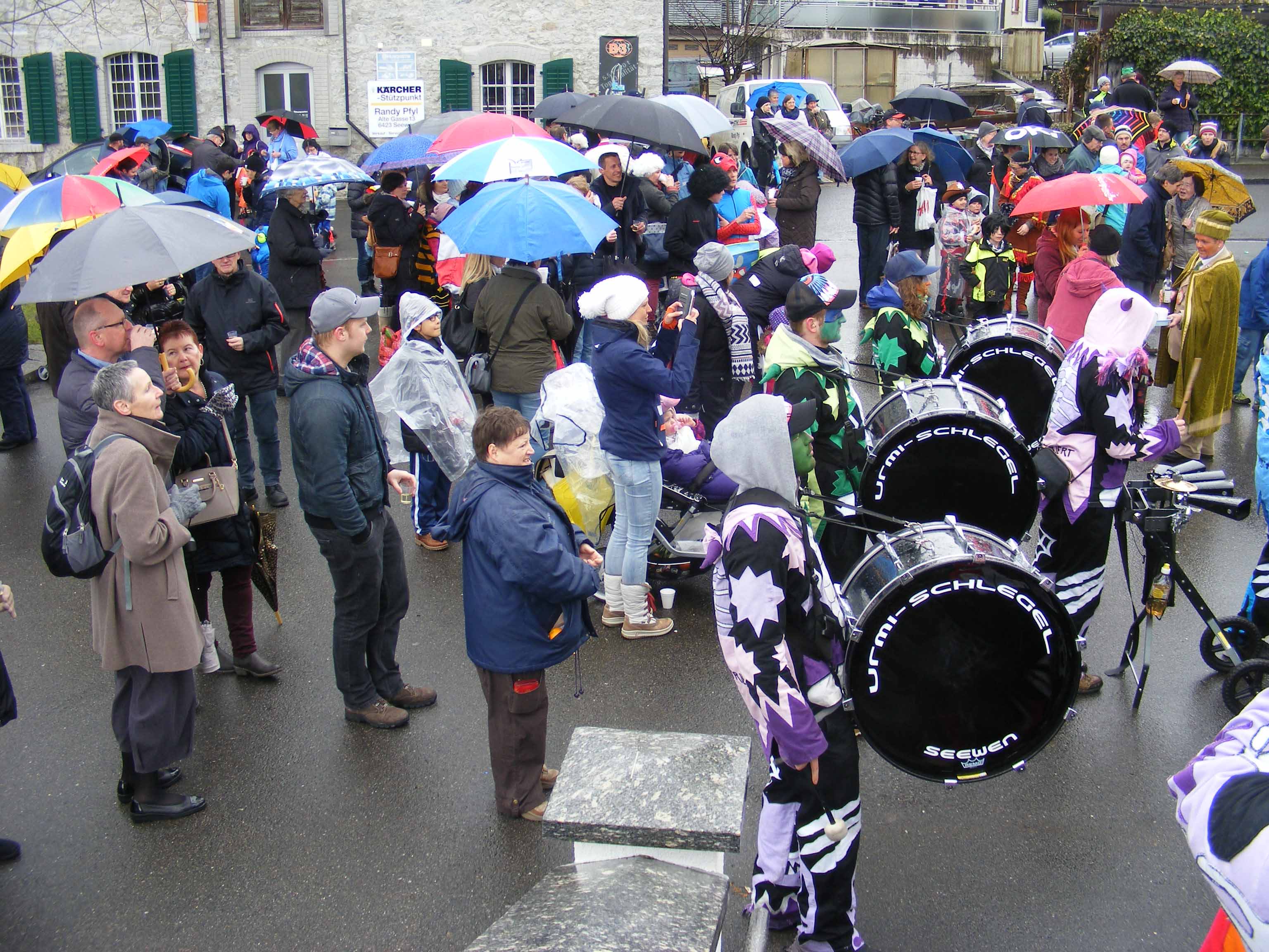 p. Der Staatsfeiertag 2017 in Addis-a-Seeba - der Güdeldienstag – gilt als Höhepunkt und gleichzeitig Abschluss der Fasnachtszeit am Fusse des Urmibergs. Es war ein Tag voller Abwechslung, auch witterungsmässig. Morgens verregnete es die kleinsten Maschgrädli, kurz nach Mittag lächelte die Sonne die ‘grossen Maschgraden’ an, bis dann um 16 Uhr ein Sturmtief der fröhlich-ausgelassenen Stimmung auf dem Seerütiplatz einen Schlussstrich setzte. Begonnen hatte die Strassenfasnacht am Fusse des Monte Urmibergs mit dem Umzug der Kinderrott durch Addis-a-Seeba. Mit rund 30 Maschgrädli war das Grüppli etwa halb so gross wie letztes Jahr. Begleitet von Nieselregen zogen die kleinen Fasnächtler - viele von ihnen in Begleitung ihrer Eltern - via Unterseewen zur Pfarrkirche, dem Ausgangspunkt zurück. Dann, kurz nach 10 Uhr, fuhren die zwei Staatskarossen auf den Vorplatz ebengenannter Kirche vor. Das zahlreich aufmarschierte Volk huldigte dem Kaiser Negus Negesti XXXVIII., Paul der Hirnibick. Bei dieser Gelegenheit ergriff der Kanzler das Wort und ehrte drei Neguaner für ihren Beitrag zugunsten des Staates: Köbi Schuler für das Sponsoring des Empfang-Apéros, ‘Bauernhof’-Wirt Roli Müller für die jährliche Aufnahme der Kinderrott und ‘Kreuz’-Wirt Peter Rickenbacher für sein Doppel-Engagement ‘Homepage-Dorfzeitung’ und Kinderrott-Bewirtung. Als Dank wurde ihnen ein ‘Negus-Oskar’ verabreicht. Nach den Ehrungen kamen aus allen Landesecken die Maschgraden und Gugger auf den Platz und stellten sich in Szene. Der Kaiser seinerseits bedankte sich via Sprecher für so viel Wertschätzung. Als Geste für so viel Aufmerksamkeit revanchierte er sich seinerseits mit einem Apéro bzw. der beliebten ‚Bescherung’ (Wurst, Brot, Orangen). Nach der Mittagsruhe startete die ‘grosse Maschgraden’-Rott anschliessend zu ihrer Bescherungstour. Ueber 30 ‚hartgesottene’ und wetterfeste Nüssler besuchten Schankhaus um Schankhaus, bevor nochmals alle Maschgraden und die Guuggen um 16 Uhr vor der Alten Kathedrale zusammen trafen. Wie bestellt, folgte just in diesem Moment der abrupte Wetterumschlag…