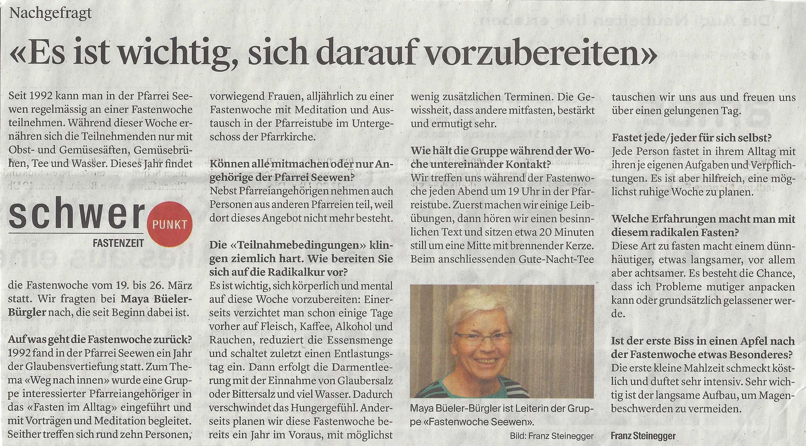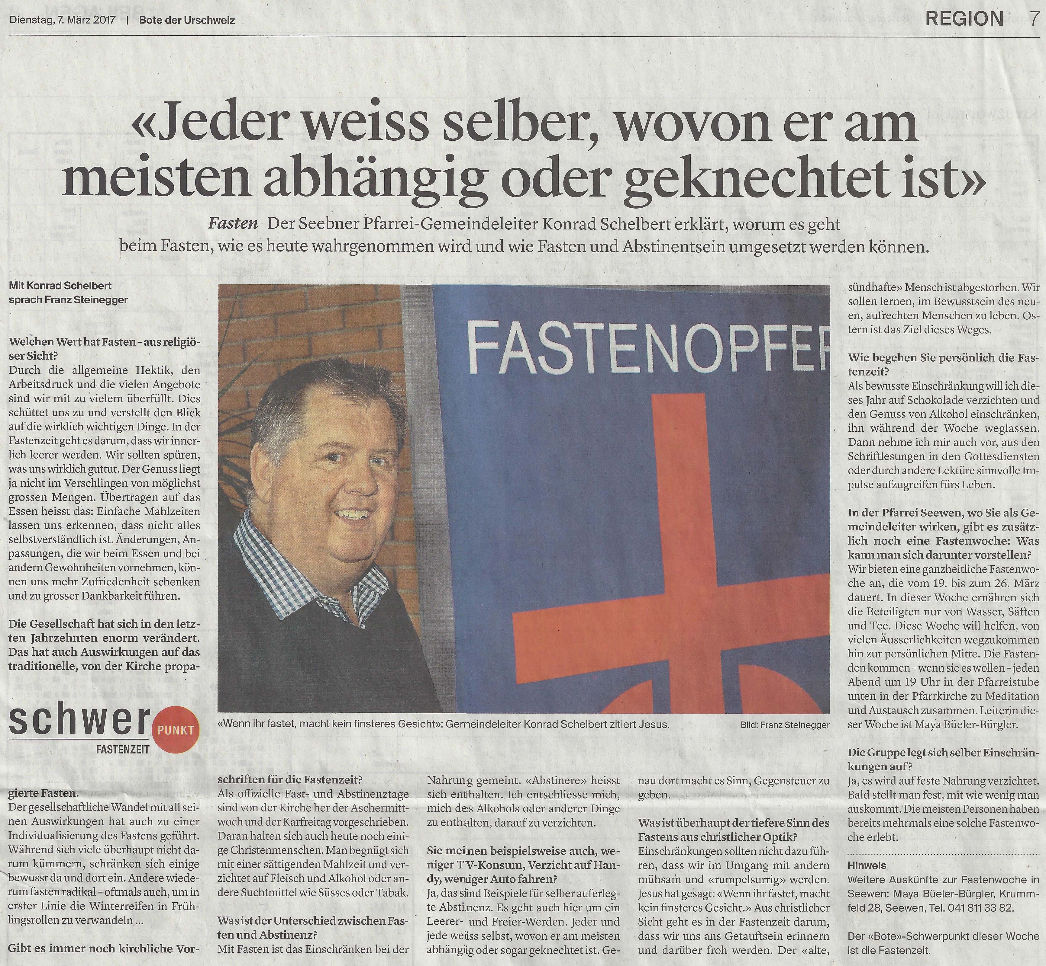 Im ‘Bote der Urschweiz’ vom 7. März hat Journalist Franz Steinegger mit dem Seebner Gemeindeleiter Konrad Schelbert über das Thema Fasten gesprochen. Nachstehend der Bericht: