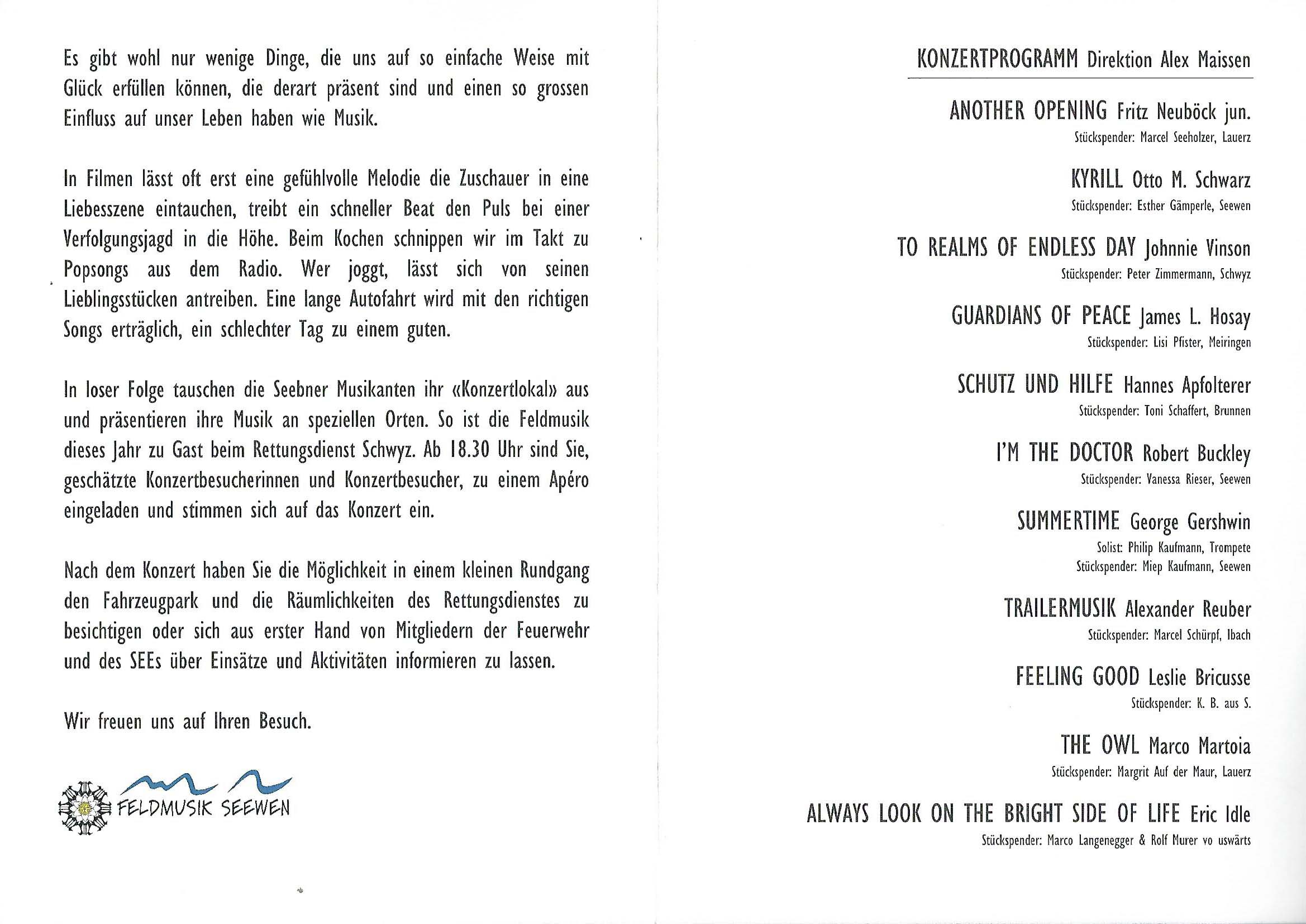 p. Für einen Ohrenschmaus der besonderen Art ist die Feldmusik Seewen bekannt. Immer und immer wieder mag sie aber auch mit optischen Auftritten zu überraschen. So auch jetzt wieder: die musikalische Truppe lädt die Bevölkerung aus nah und fern an einen ganz speziellen Ort ein: in die Fahrzeughalle des Rettungsdienstes Schwyz. Hier wird Musik gespielt, die direkt die Herzen erreichen sollen. Wer sich den Samstag-Abend (10.6.2017) freimachen kann, dem sei der Besuch des Konzertes wärmstens ans Herz gelegt…