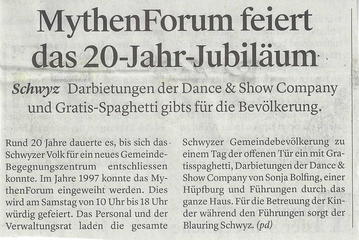 Mit diversen Aktionen blickt das MythenForum nun auf seine 20 Jahre seines Bestehens zurück. Im ‘Bote’ wurden dieser Tage diverse Themen rund um das Jubiläum beschrieben, das seinen Höhepunkt am 30. September hat: