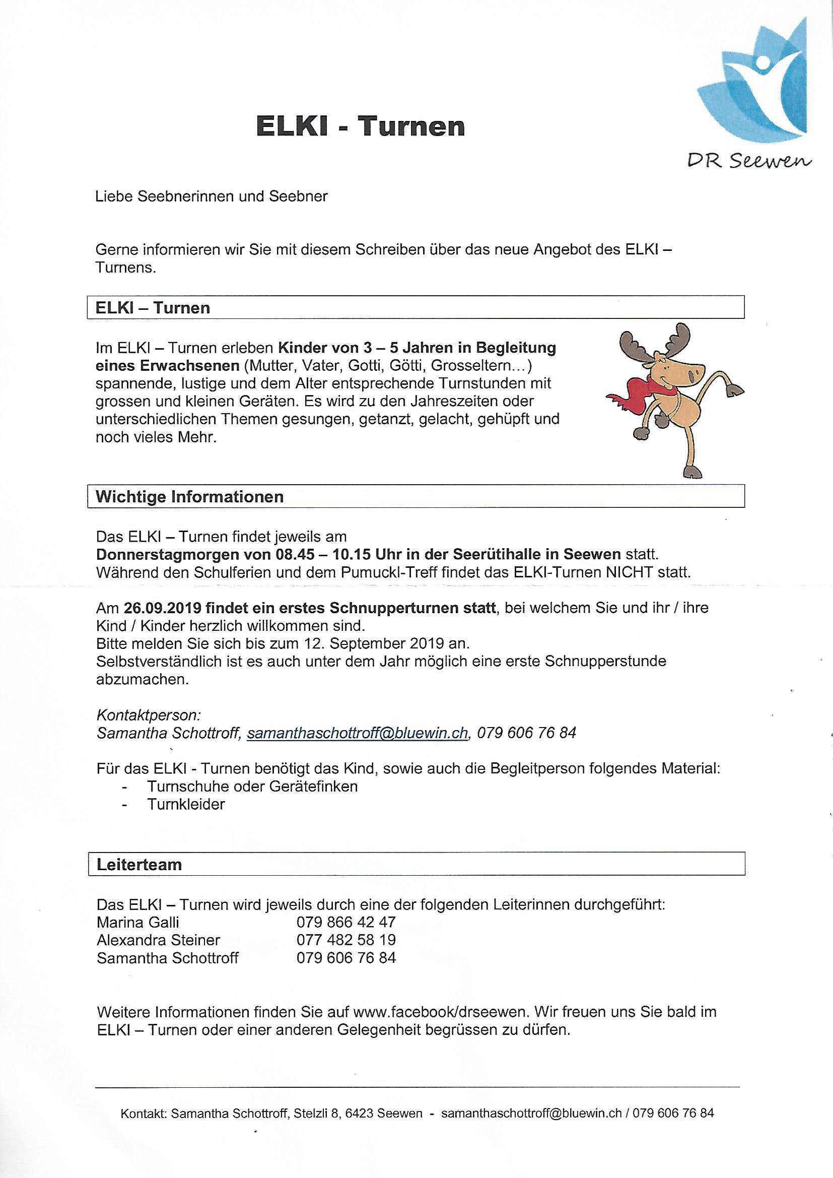 - Die Damenriege hat ein neues Angebot ins Leben gerufen, das ELKI-Turnen, ein Eltern-Kind/-er-Turnen. Infos darüber wurden via Flugblatt verteilt: