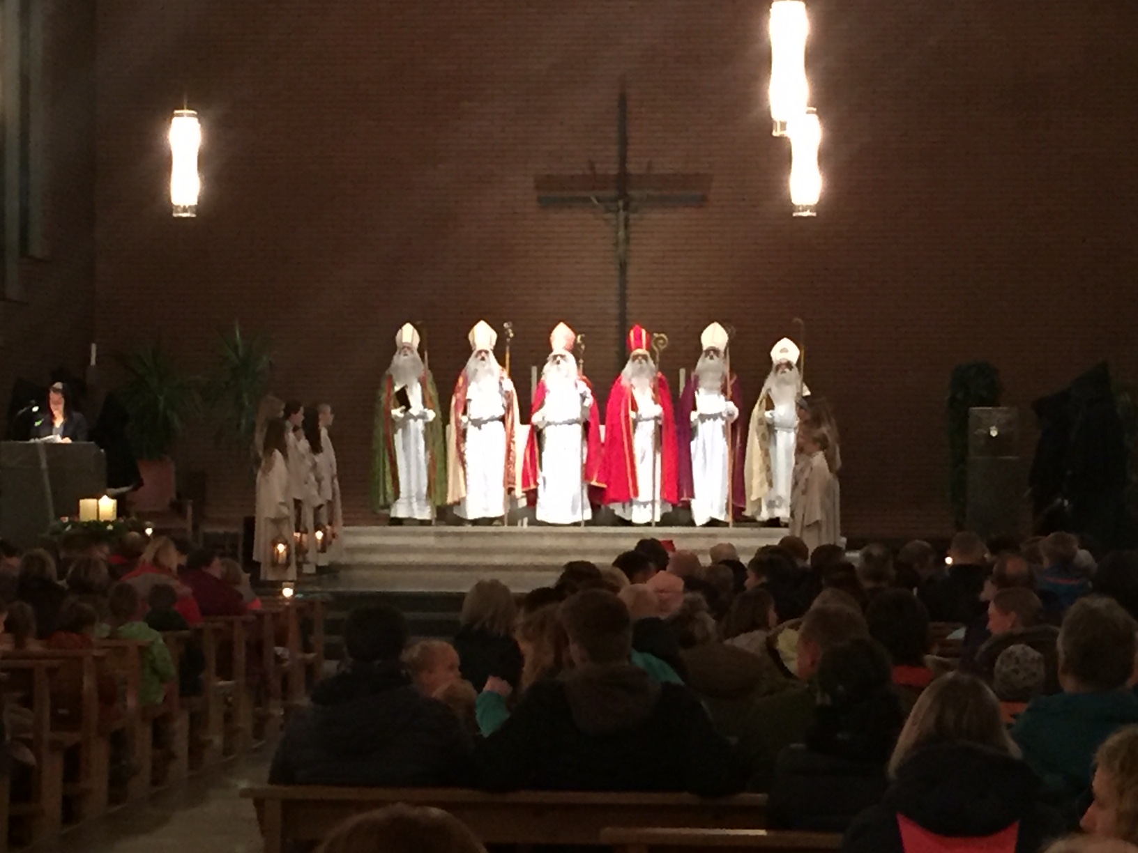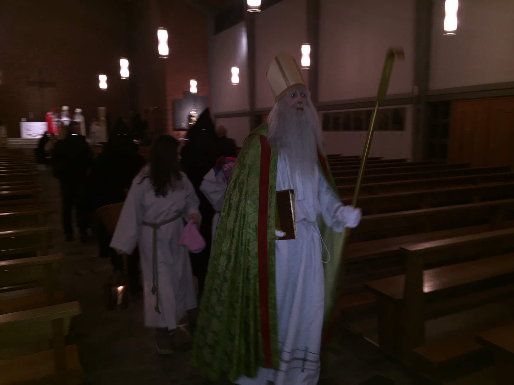 p. Jeweils am Sonntag, der nahe am 6. Dezember liegt, zieht in Seewen der ‘Samichlaus’ von Haus zu Haus. Das war auch jetzt wieder der Fall. Am Vorabend des 1. Adventssonntags, - heuer zufälligerweise am 1. Dezember - riefen um 17 Uhr die Glocken der Pfarrkirche zur Kleinkinder- und Familienfeier ins Gotteshaus. Hier in diesen ‘heiligen Hallen’ wurde der ‘Samichlaus’ ‘gefeiert’, die Feier war speziell für kleine Kinder ausgerichtet. Nach einer halben Stunde zog der ‘Samichlaus’ dann in sechs Gruppen – alle begleitet von Ministranten und Schmutzlis – auf den Kirchenvorplatz, wo er von viel Volk begrüsst wurde. Er seinerseits beschenkte die Anwesenden mit Lebkuchengebäck und hörte sich dabei das eine oder andere ‘Versli’ an. Als alle Anwesenden vom St. Nikolaus beehrt wurden, machte er sich mit seinen Helfern auf in die dunkle Nacht, um den nicht immer ganz lieben Schäfchen der Pfarrei einen Besuch abzustatten…