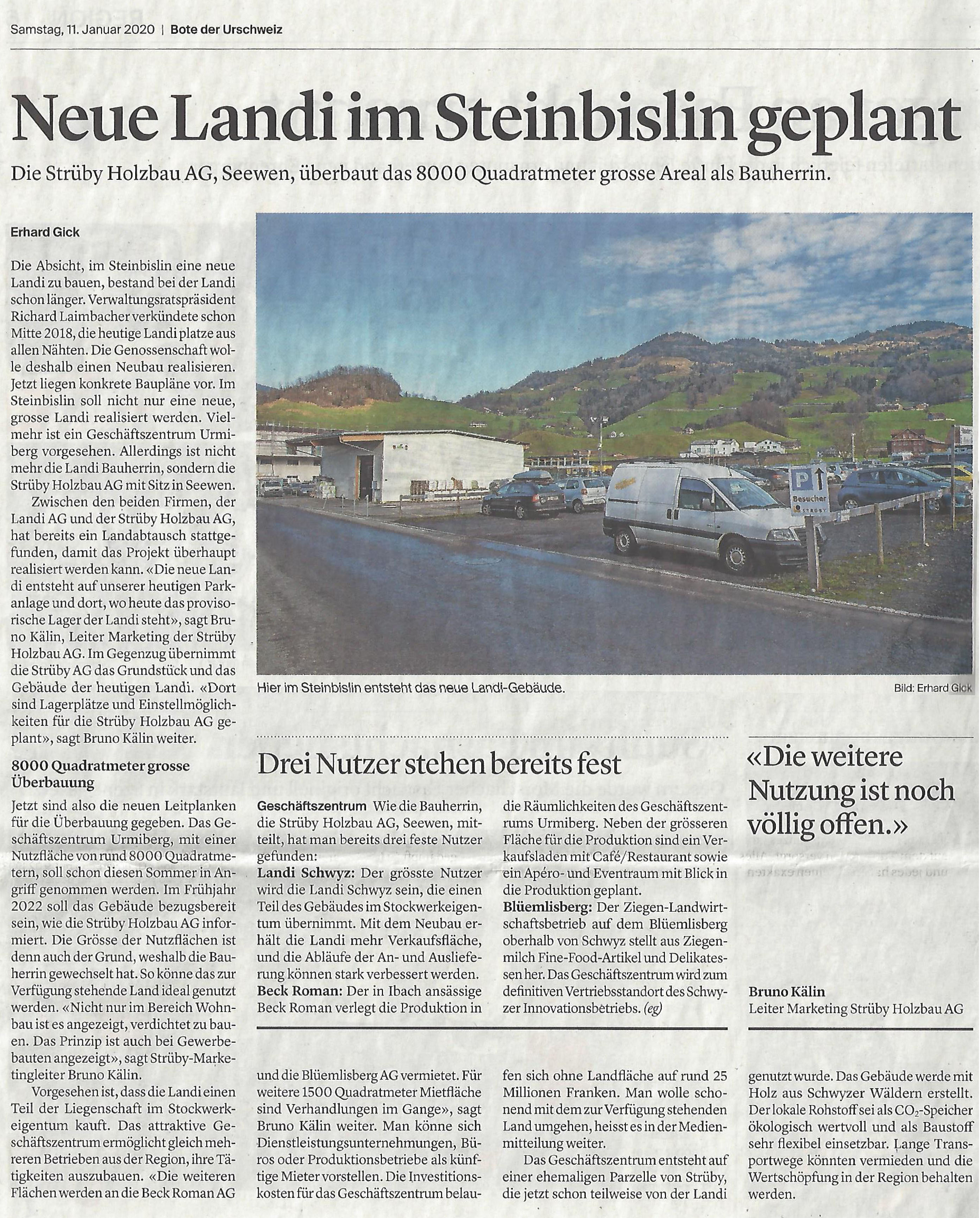 p. Kürzlich wurde bekannt, dass die Arthur Weber AG am östlichen Dorfrand von Seewen einen Neubau realisieren will (Siehe Meldung vom 6.1.2020). Jetzt ist publik geworden, dass die Holzbau Strüby-Gruppe es der Firma gleichtut. Das innovative Unternehmen plant im Gebiet ‘Steibissli’ eine grosses Neubaute mit über 8000 Quadratmetern Nutzfläche. Dies hat der ‘Bote der Urschweiz’ ausfindig gemacht, der in seiner Ausgabe vom 11. Januar 2020 ausführlich über das grosse Vorhaben berichtete: