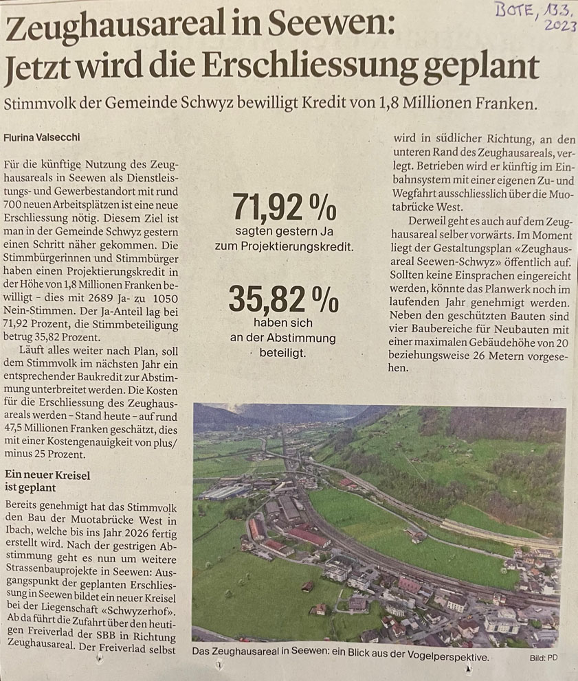 p. Mit fast 72 % der abgegebenen Stimmen hat das Volk der Gemeinde Schwyz einem Planungskredit über 1,8 Millionen Franken am Wochenende vom 11./12. März 2023 zugestimmt. Mit dem Ja stehen die Signale auf Grün im Finden der Antwort, wie das annähernd 80'000 Quadratmeter grosse Areal des ehemaligen eidg. Zeughaus-Betriebes Seewen-Schwyz an das übergeordnete Strassennetz angeschlossen werden soll. Denn mit dem gesprochenen Geld soll aufgezeigt werden, wie genau die Anschlussbauten aussehen könnten. Im Fokus steht dabei die Anbindung des Areals an die Bahnhofstrasse. Angedacht ist ein Kreisel vor dem 'Schwyzerhof', über welchen das 'Erwartungsareal' aus Westen erschlossen werden soll. In süd-östlicher Richtung ist schon Vieles klarer; dort soll eine neue Brücke über die Muota den Anschluss vom/zum Autobahnanschluss Ingenbohl gewährleisten.