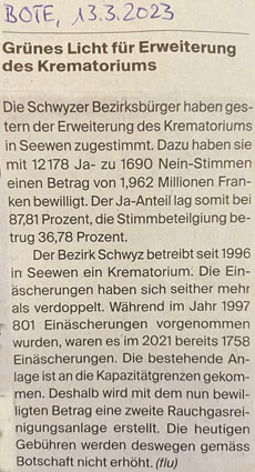 p. Vor bald 30 Jahren liess der Bezirk Schwyz in Unterseewen unmittelbar neben der Autobahn ein Krematorium bauen. Die Zahl an Einäscherungen hat in dieser Zeit massiv zugenommen. So verwundert es nicht, dass die Kapazitäten irgendwann einmal ausgeschöpft sein mussten. Das ist jetzt der Fall. Daher hat der Bezirk das Volk um einen knapp 2-Millionen-Franken-Kredit gebeten. Damit soll eine zweite Rauchgasreinigungsanlage erstellt werden, womit die Zahl an Einäscherungen künftig weiter nach oben gehen kann...