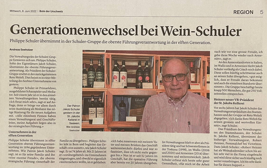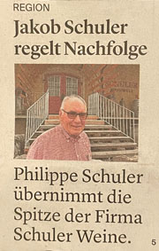 p. Folgende zwei Ereignisse seien an dieser Stelle für die Nachwelt festgehalten. Das Erste: Köbi Schuler, der Inbegriff der 'Schuler Weine', tritt kürzer. Er gab im Sommer die Führungsverantwortung ab - familienintern. Neuer 'Chef' des Weinhandelshauses ist Sohn Philippe Schuler, der die elfte Generation des Traditionshauses verkörpert.