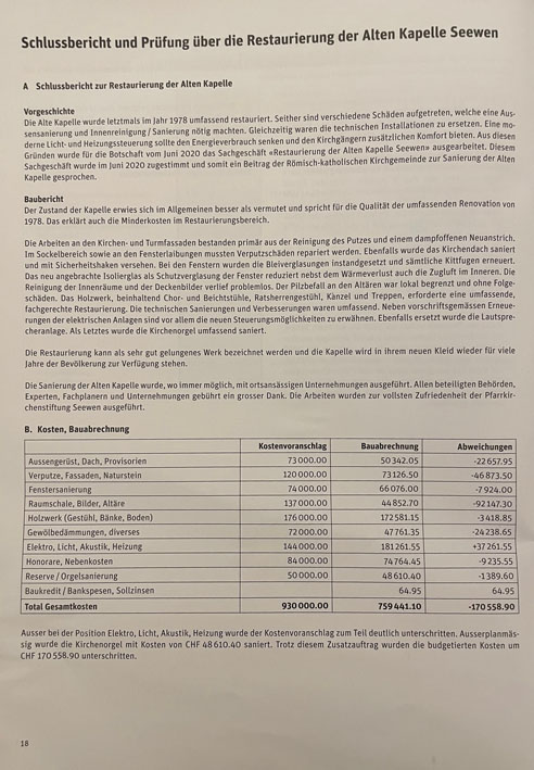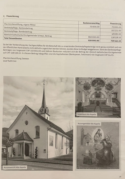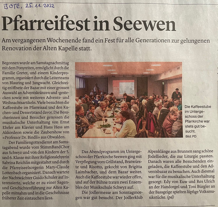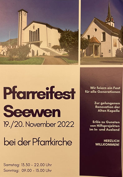 Es gehört zur Tradition der Pfarrei Seewen, benachteiligten Mitmenschen zu helfen. Jeweils im Spätherbst hat sie während Jahren eigens ein Fest auf die Beine gestellt: das Pfarrei-Missionswochenende. Während zweier Tage hatten hierfür viele freiwillige Hände allerlei Attraktionen ins Leben gerufen, um auf diese Art Geld für Bedürftige zu sammeln. An der Idee hat sich grundsätzlich nicht viel geändert, doch heuer heisst der Anlass 'Pfarreifest'. Dieses Fest findet am 19. und 20. November in, unter und neben der Pfarrkirche statt, wie einem Flyer entnommen werden kann. Das Fest stellt aber auch den Abschluss der umfangreichen Renovation der Alten Kapelle hier in Seewen dar.