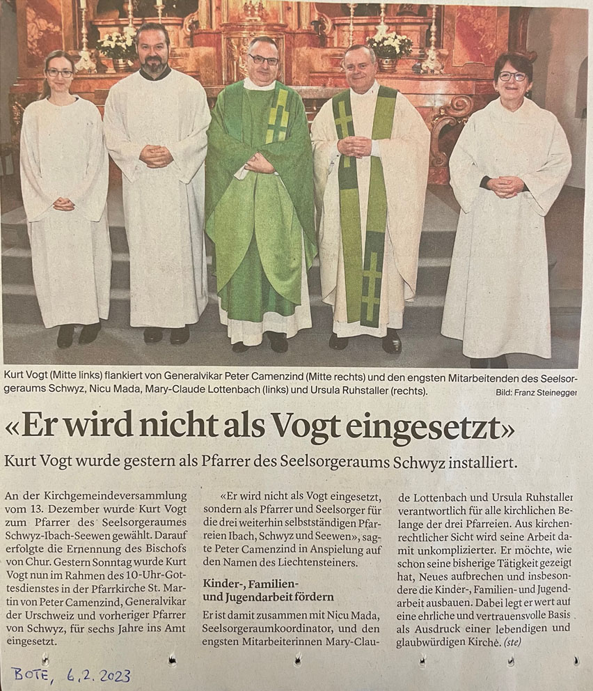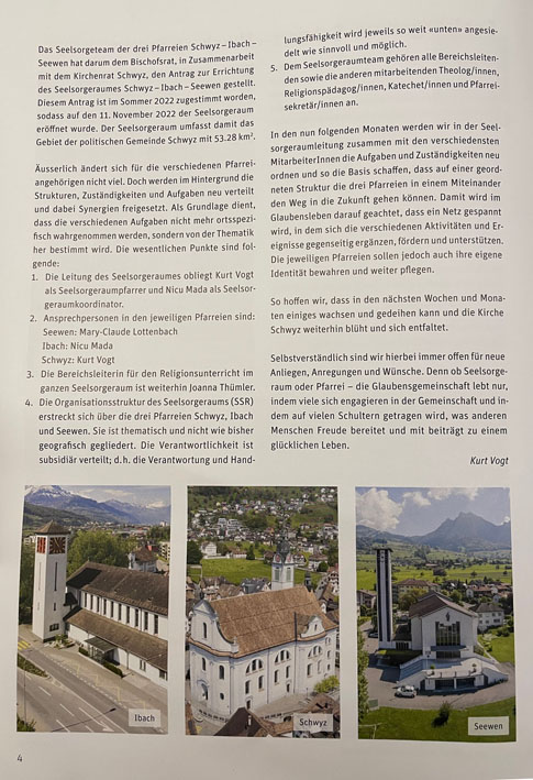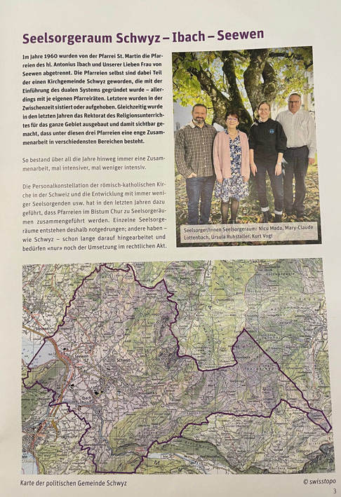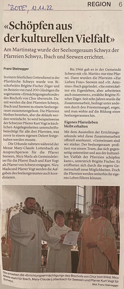die Pfarreien Schwyz, Ibach und Seewen wurden zu einem Seelsorgeraum zusammengefasst. Im Kern geht es dabei darum, Synergien zu nutzen und Abläufe innerhalb der Gemeinschaft zu vereinfachen. Im 'Bote' vom 12 November wurde über die Neustrukturierung wie folgt berichtet: