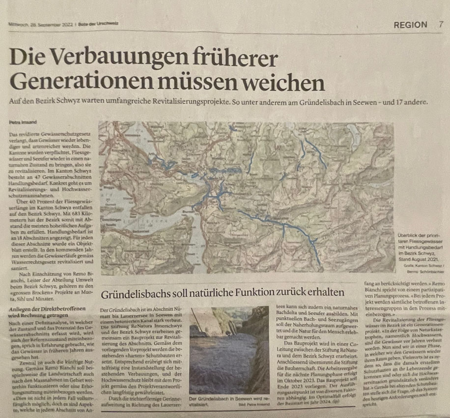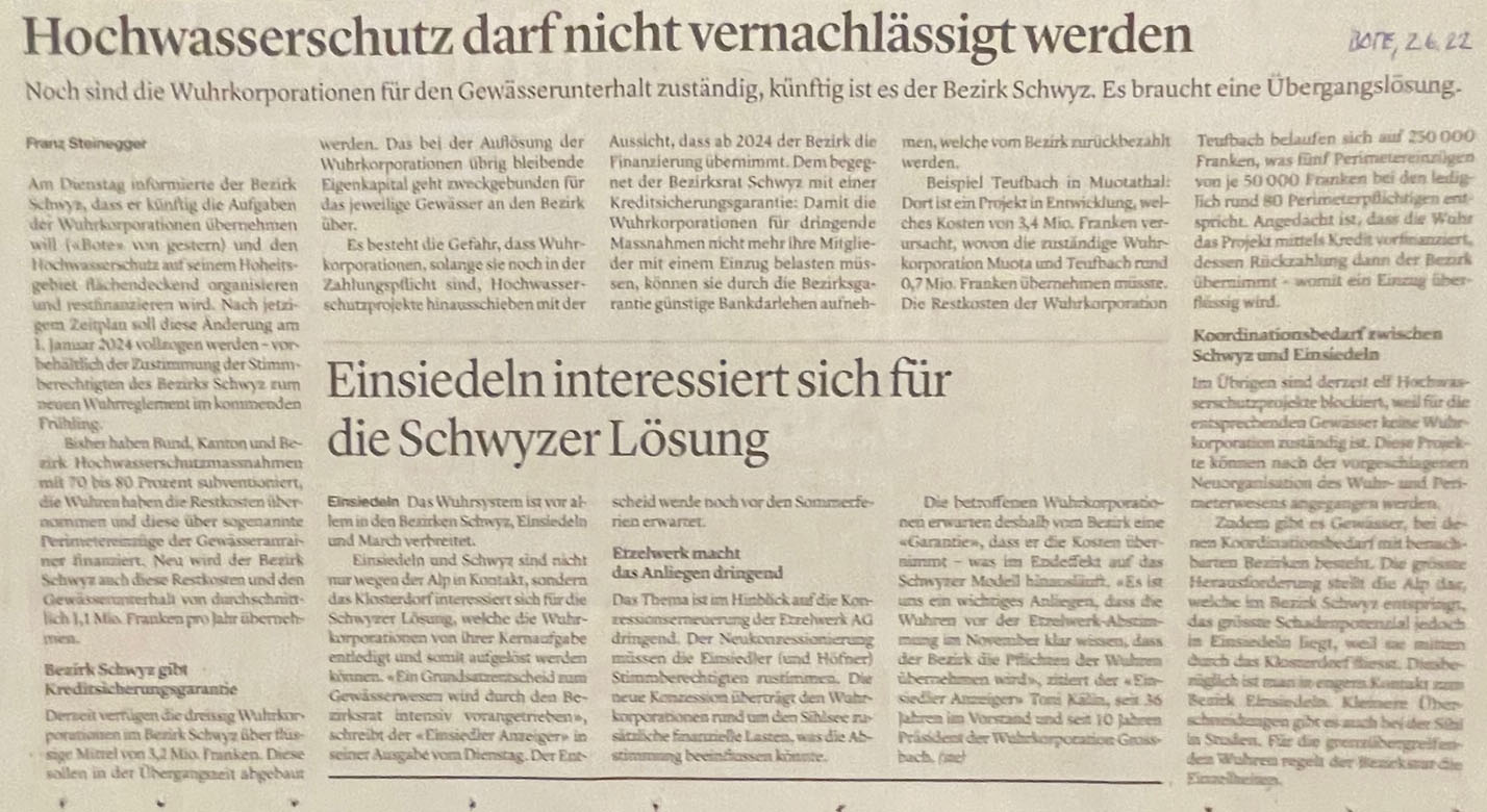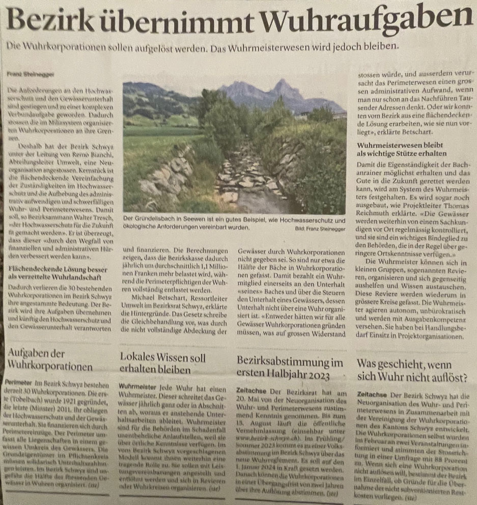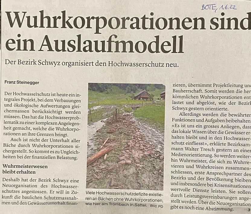 Sie unterhielten diese. Doch das soll bald Vergangenheit sein. Das Denken, wie die Gewässer künftig hydrologisch und dem Zeitgeist entsprechend auszusehen haben, das ist heute anders als noch vor Jahren. Extreme Wetterverhältnisse mit Ueberschwemmungen und Trockenheit samt Folgeschäden in Siedlungen und auf Kulturflächen 'zwingen' zu Massnahmen. So hat u.a. der Bezirk Schwyz den Grundsatzentscheid getroffen, das 'System Wuhrkorporationen' umzukrempeln. Neu will er selbst mehr Mitsprache, aber auch für Kosten aufkommen. Damit würden die bisherigen Korporationen mehr oder weniger 'entmachtet' oder gar gänzlich aufgehoben.
