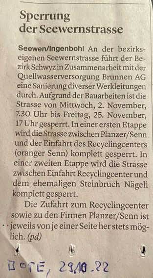 p. Sie ist nebst der Bahnhofstrasse die zweitstärkst-belastete Strasse in Seewen, die Seewernstrasse. Als Verbindungsstrasse zwischen Ingenbohl, Ibach und Seewen nimmt sie einen Grossteil des Schwerverkehrs auf, der von bzw. nach der Industrie- und Gewerbezone im Grossraum ‘16ni’ führt. Jetzt muss sie wiederum einmal gesperrt werden. Grund dafür sind umfangreiche Werkleitungserneuerungsarbeiten. Zwischen dem 2. und 25. November muss sie daher temporär für den motorisierten Verkehr gesperrt werden, ein Durchkommen des Langsamverkehrs ist hingegen jederzeit möglich. Die andere positive Nachricht: von jeweils einer Seite ist die Strasse bis zur Baustelle auch für den motorisierten Verkehr benutzbar. Nachstehende Meldung dazu erschien im ‘Bote’: