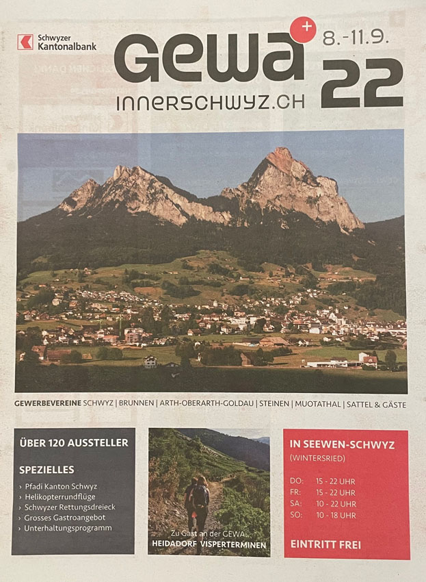 p. In wenigen Tagen öffnen die Organisatoren - nach einer 'Corona'-bedingten vierjährigen Pause - die Türen zu einer weiteren GEWA, einer Leistungsschau des regionalen Gewerbes. Erstmals werden dazu die Zelte nicht mehr im Dorf Seewen, sondern auf benachbartem Ibächler-Boden aufgeschlagen (ennet dem Nietenbach). Im 'Wintersried' zwischen Lager- und Fabrikgebäuden werden während vier Tagen eine Hundertschaft Gewerbe- und Dienstleistungsbetriebe sowie Rettungsdienste ihre Leistungsfähigkeit dem interessierten Publikum präsentieren. Dieser Tage wurde die GEWA-Zeitung der 9. Ausstellung in die nahen Haushaltungen verteilt. Viel Infomaterial ist auch unter www.gewa-innerschwyz.ch zu lesen. Nachstehend das Titelblatt der GEWA-Zeitung: