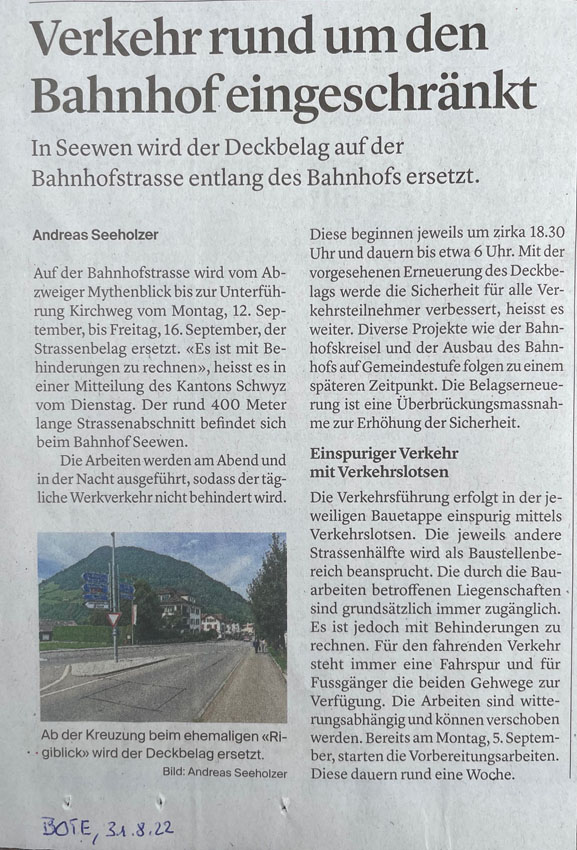 p. Je mehr sie benutzt wird, desto grösser deren Abnutzung... Wer regelmässig die Bahnhofstrasse hoch- oder herunterfährt, dem sind die Veränderungen des Strassenbelags schon länger aufgefallen. Justament hat daher der Strassenträger, der Kanton Schwyz, einen neuen Deckbelag in Auftrag gegeben. Der 'Bote' hat davon Kenntnis bekommen und am 31. August wie folgt darüber berichtet:
